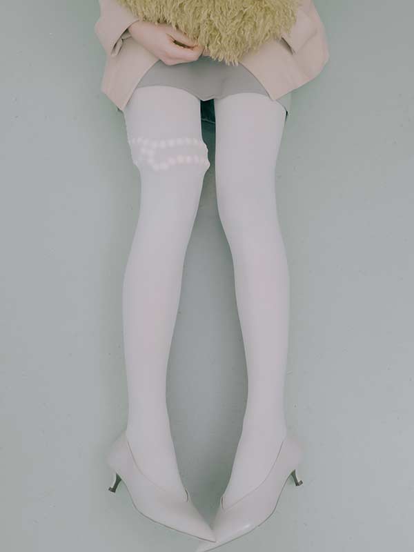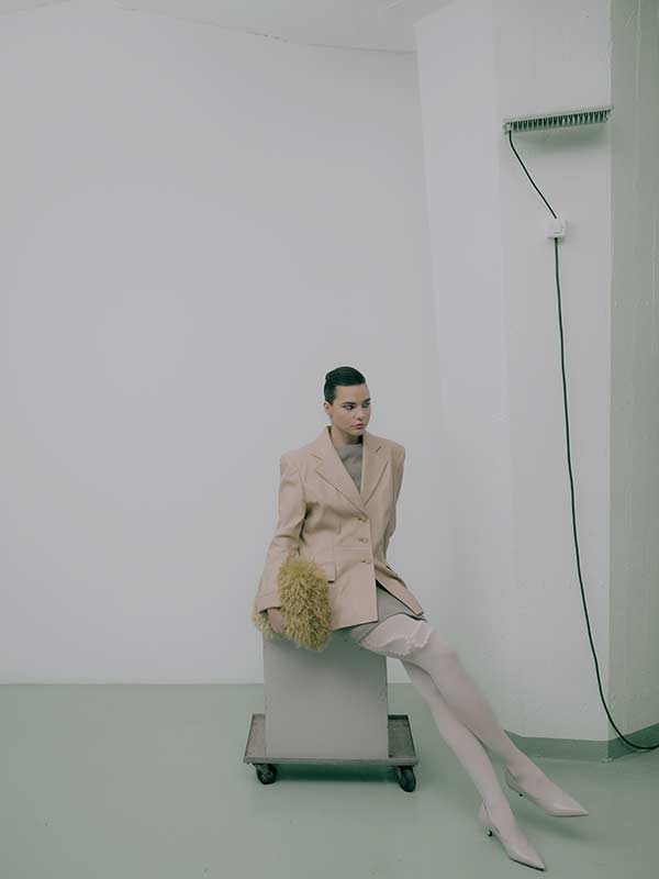 Strumpfhose von WOLFORD. Schuhe von LE MONDE BERYL. Tasche von PARFOIS. Perlenkette von ASOS. Blazer von VINTAGE.