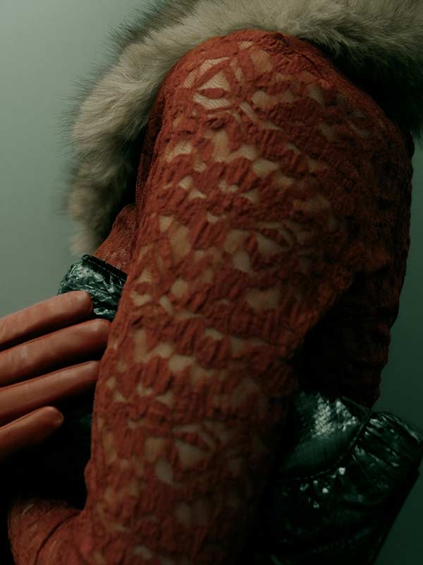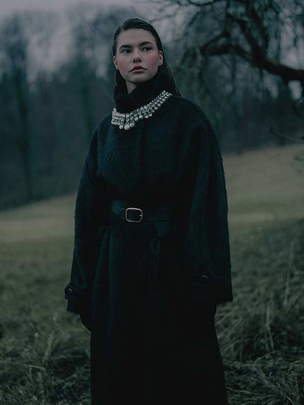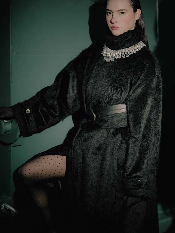 Mantel von F.A.V. Schuhe von PRADA. Strumpfhose von WARDROBE.NYC. Handschuhe von NOUR HAMMOUR. Halskette von MOSCHINO. Gürtel von ASOS.