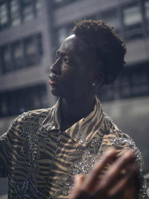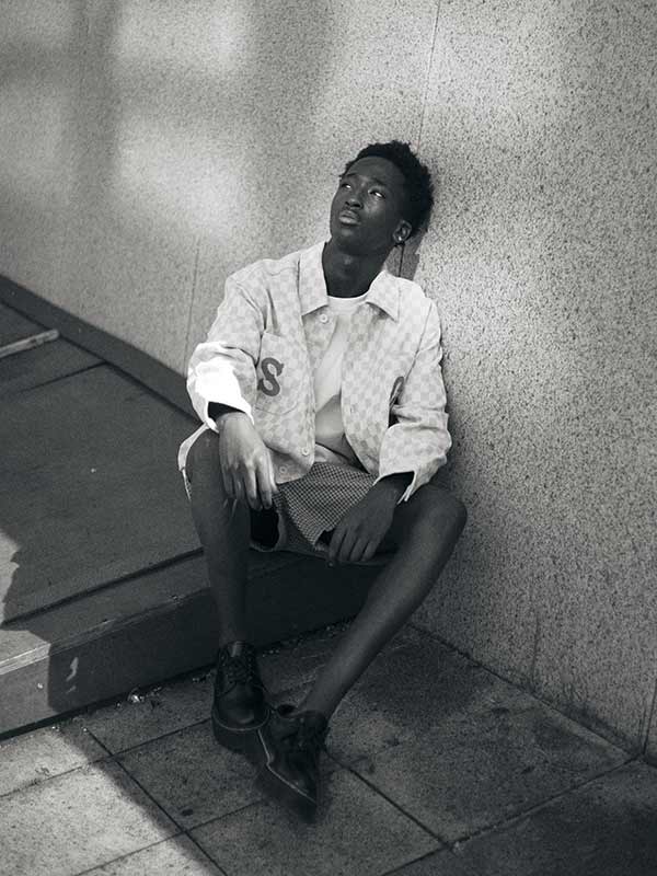 T-Shirt von MIRA PARIS. Shorts von MOSCHINO. Jacke von PROHIBITED.