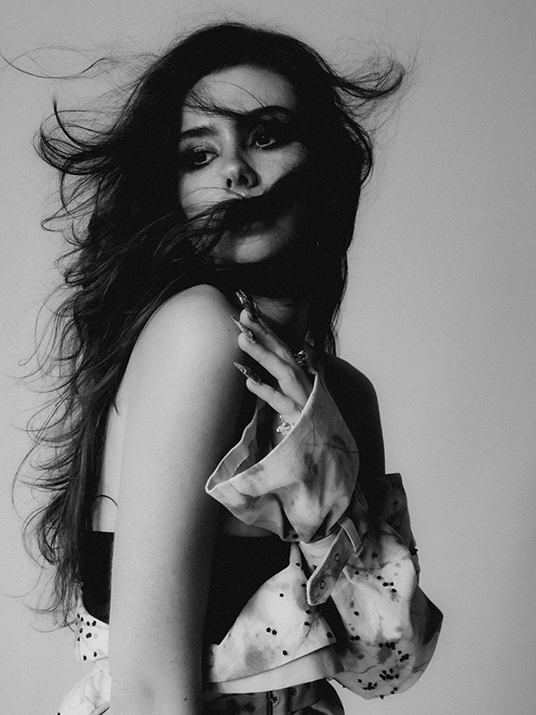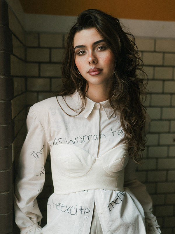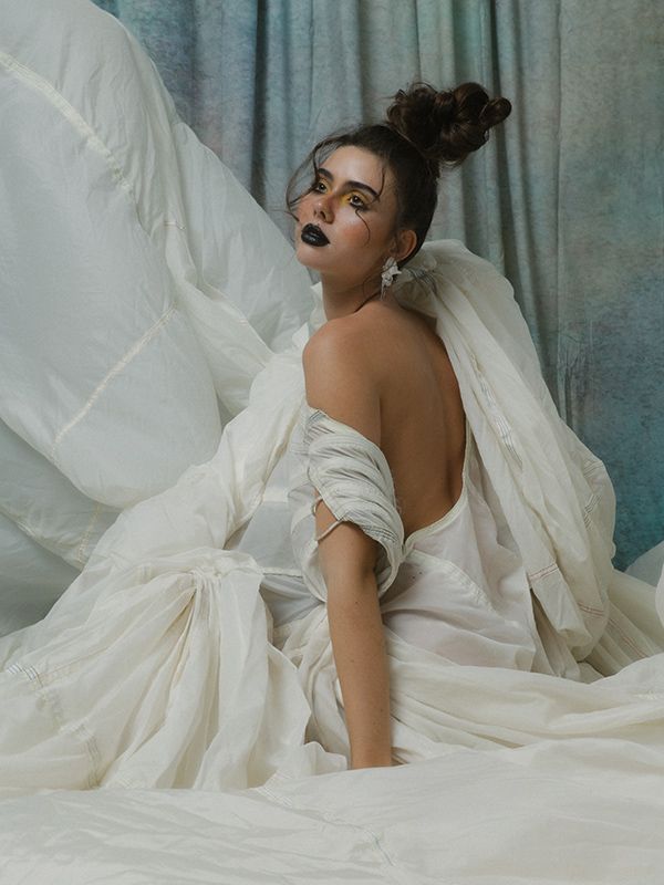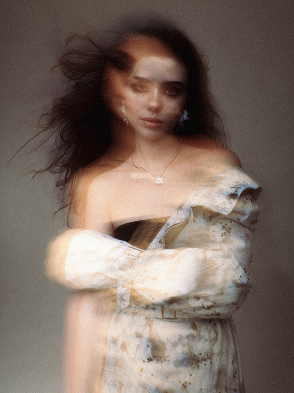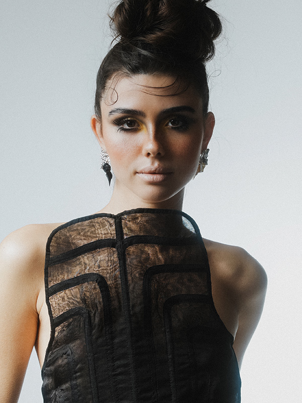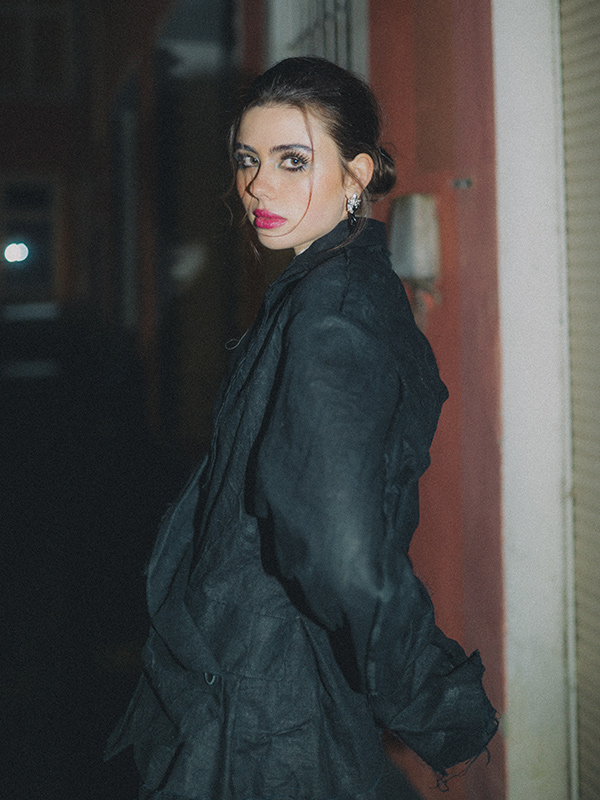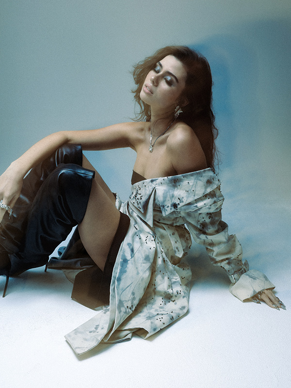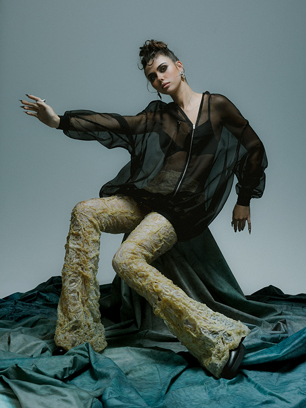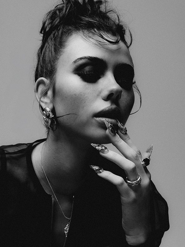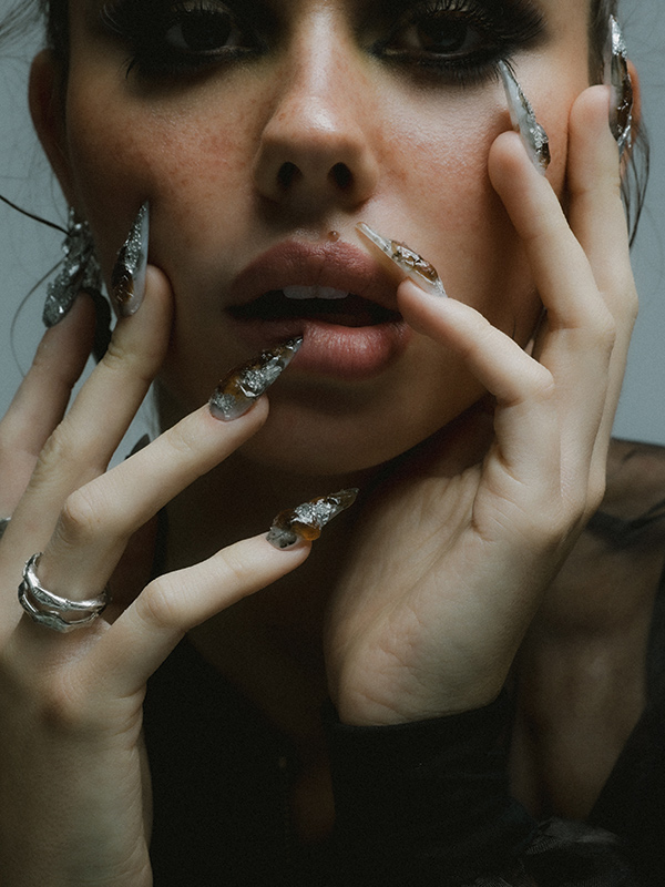 Ganzer Look von CÉLINE EGGENSCHWILER. Schmuck von ATELIER PARK 217. Nägel von LUISA SCHRÖTELER.