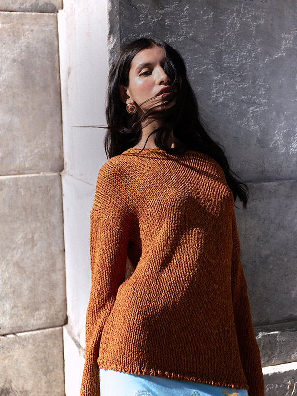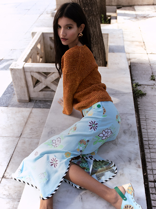 Strickpullover von MASSIMO DUTTI. Rock und Schuhe von ERGON. Tasche von CALLISTA. Ohrringe von MANGO.