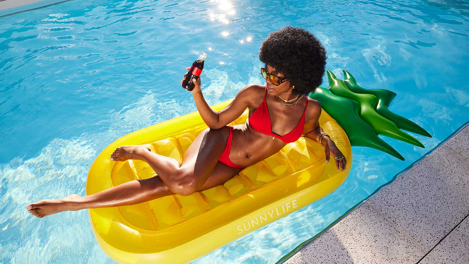 Bikini von NOOKINI. Sonnenbrille von SWAROVSKI. Armband von MAJE. Schmuck von TARA STYLE.