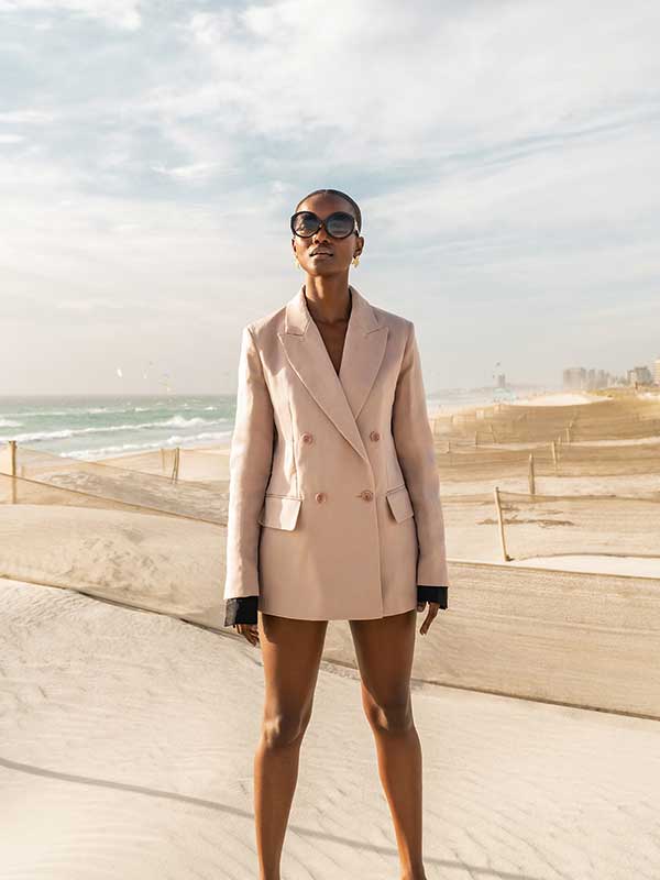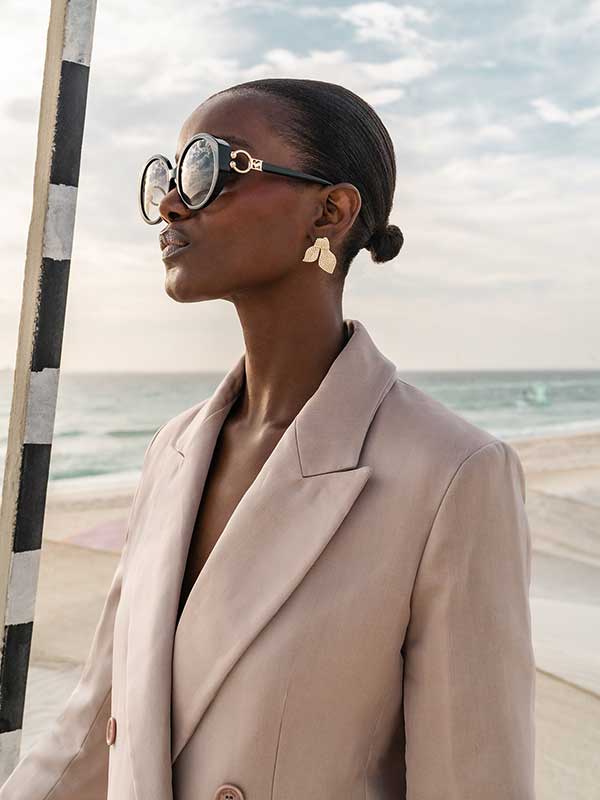 Sonnenbrille von ESCADA. Ohrringe von CLASSY AND FABULOUS. BH von UNDERSTATEMENT. Blazer und Shorts von MAX MARA.