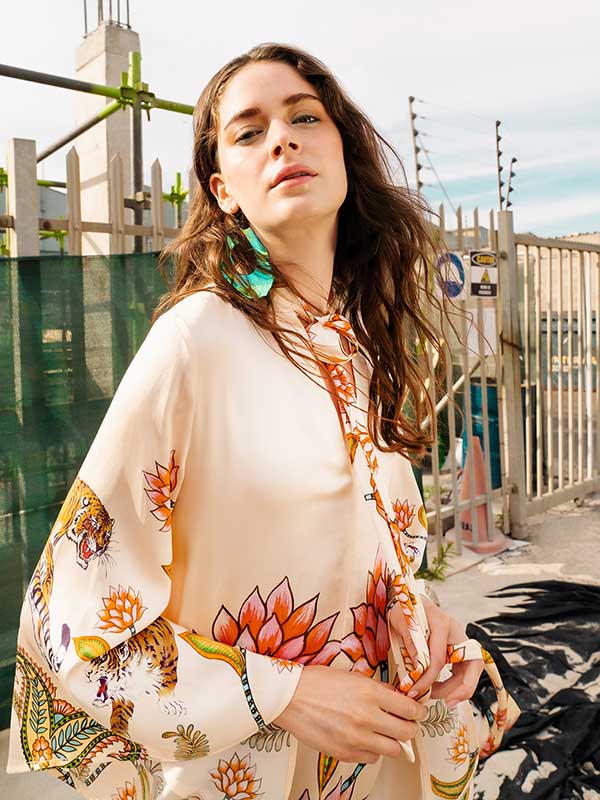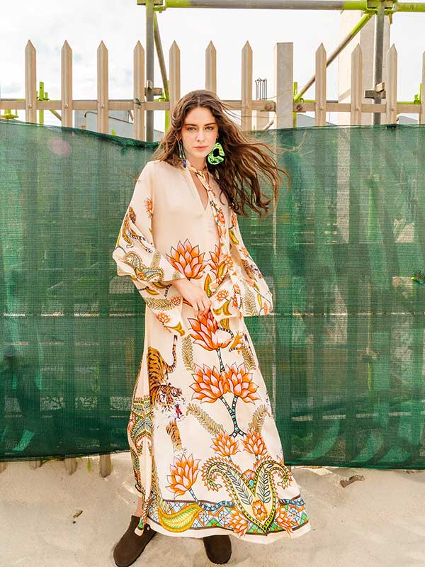 Ohrringe von IMPARI. Kaftan-Seidenkleid von SIMONE BRUNS. Schuhe von BIRKENSTOCK.