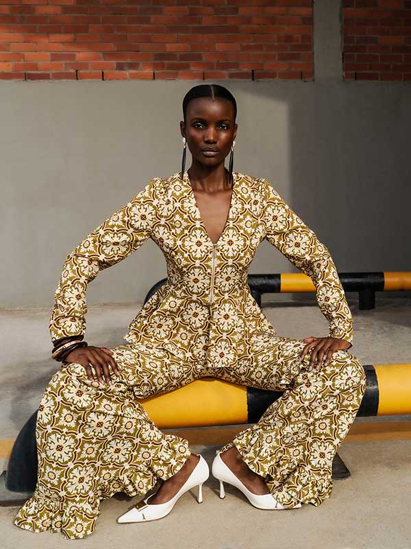 Ohrringe von SONNIA JEWELLERY DESIGN. Top und Hosen von MARCEL OSTERTAG. Armringe von VINTAGE BY THE STYLIST. Schuhe von HÖGL.