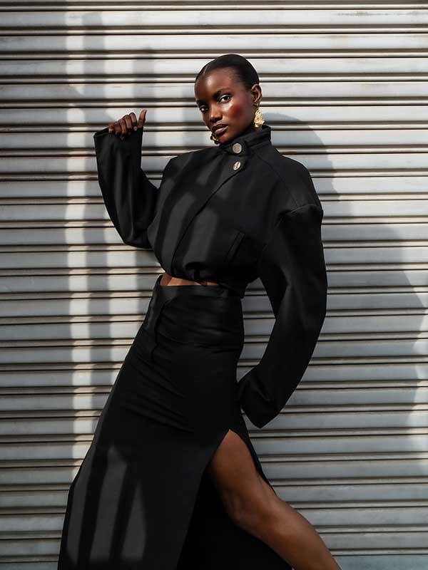 Ohrringe von IMPARI. Blouson und Rock von SPORTMAX. Schuhe von MAX & CO.