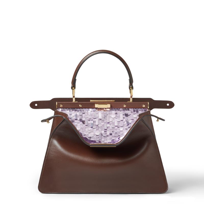 Das Besondere an der Peekaboo ist ihre konstruierte Lässigkeit. Durch einen Dreh am Verschluss klappt die Vorderseite nach unten und enthüllt das Innenleben – ein Effekt, den man im Hause Fendi liebevoll als „Sorriso“ bezeichnet. Und dieses Lächeln strahlt 2026 heller denn je. Nehmen wir zum Beispiel das Modell in tiefem Mahagonibraun: Von außen wirkt es so seriös und elegant wie ein Espresso in einer Bar an der Piazza Navona. Doch wer den Dreh raus hat, blickt auf ein Meer aus schimmernden purpurnen Pailletten, für die ein Kunsthandwerker in den Ateliers in Rom mehr als 40 Stunden damit verbracht hat, um sie von Hand zu applizieren.