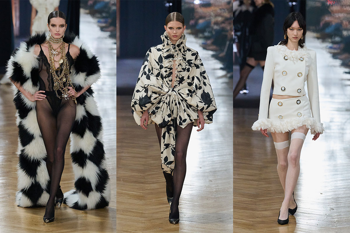 Die Silhouetten sind mutig und voluminös, geprägt von Minikleidern, skulpturaler Outerwear und dramatischen Capes. Eine Palette aus Schwarz, tiefem Rot, Weiss, Silber und Gold bestimmt die Kollektion und erzeugt eine dunkel-cinematische Stimmung. Blumarines ikonische Rose wird zum zentralen Motiv und erscheint in Prints, Stickereien und dreidimensionalen Applikationen. Sie zieht sich durch Taffeta-Ballonkleider, Vinyl-Bomberjacken, Chiffonkleider und überfärbte Denim-Hosen. Metallische Interpretationen verwandeln die Blume in silberne Spitzenstickereien oder goldene Chainmail-Minikleider.