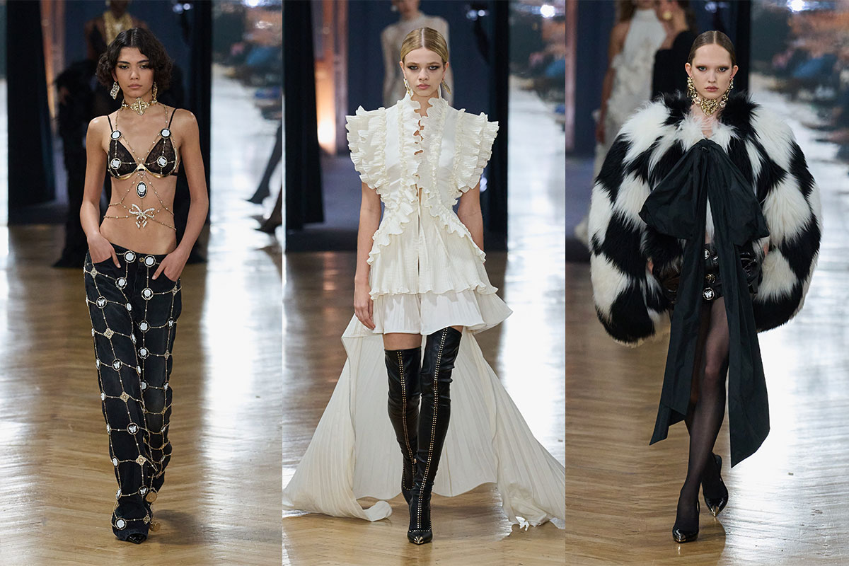 Textur und Ornament treiben die Kollektion weiter voran. Chantilly-Spitze, Crinoline-Röcke und Crepon-Rüschen bringen romantische Fragilität, die durch härtere Elemente wie skulpturale Metall-Hardware und Korsettkonstruktionen gebrochen wird. Barocke Referenzen erscheinen in Cameo-Buttons, Kreuzen und opulentem Schmuck, während gitterartige Metallkäfige und harness-ähnliche Konstruktionen Komas skulpturale Handschrift unterstreichen.