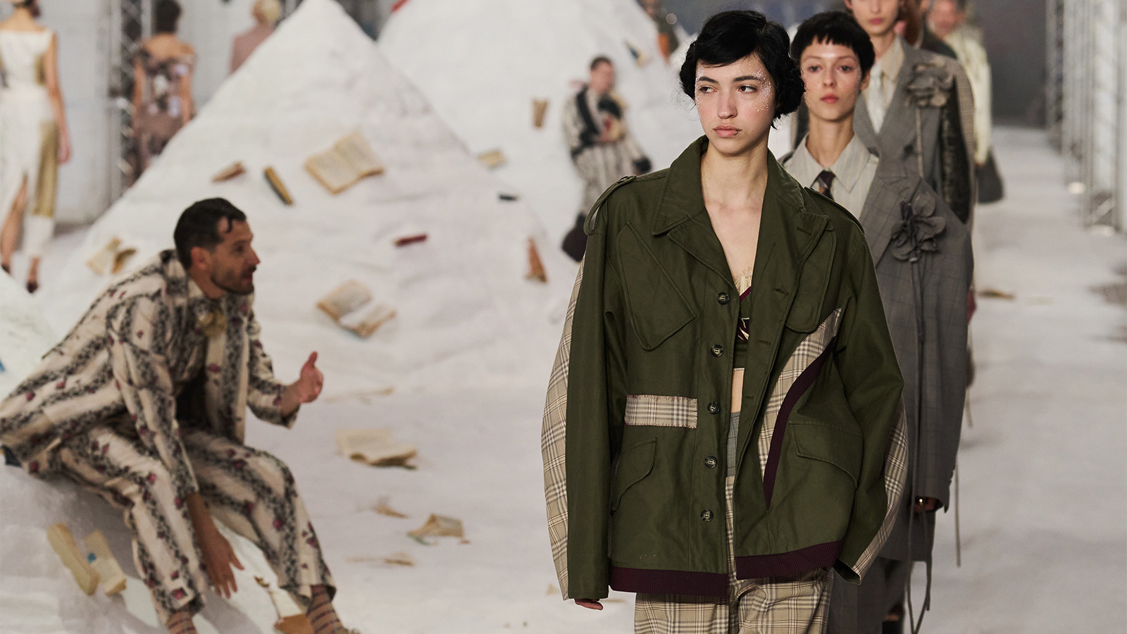 Antonio Marras macht seine Runways schon lange zu Theaterbühnen – seine Shows sind immer intim, seine Kollektionen tief verwurzelt im Storytelling und immer mit einer Prise Romantik. Für SS26 hat er diese Vision weitergeführt: Das Set war inspiriert von den Salzfeldern von Alghero auf Sardinien. Der Laufsteg entfaltete sich zwischen weißen Dünen, überzogen mit Büchern, als wären Seiten über die Landschaft verstreut. Manche Models liefen klassisch, andere spielten Momente des Theaters – rennend, innehaltend, kletternd, Seiten aus Büchern reißend wie verletzte Liebende – eine Szene voller Emotion, die die Kollektion zum Leben erweckte. Genau so sollte Mode sein.