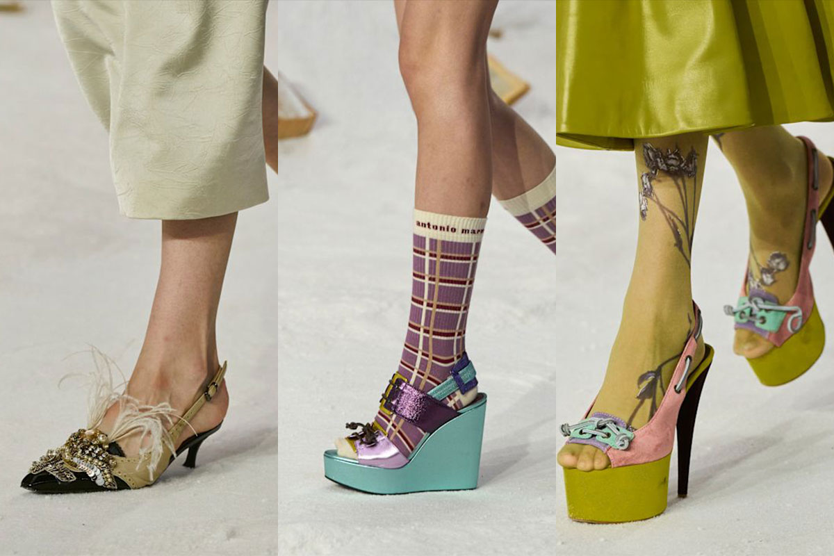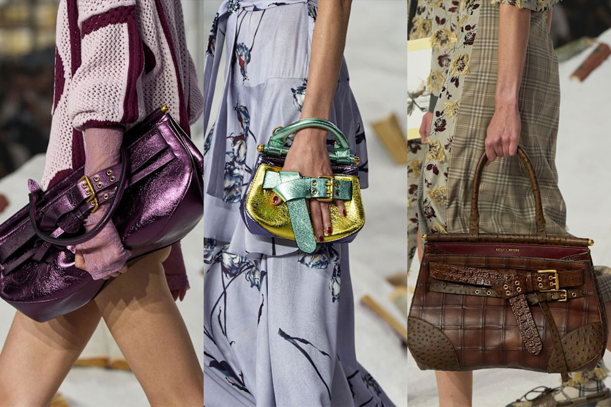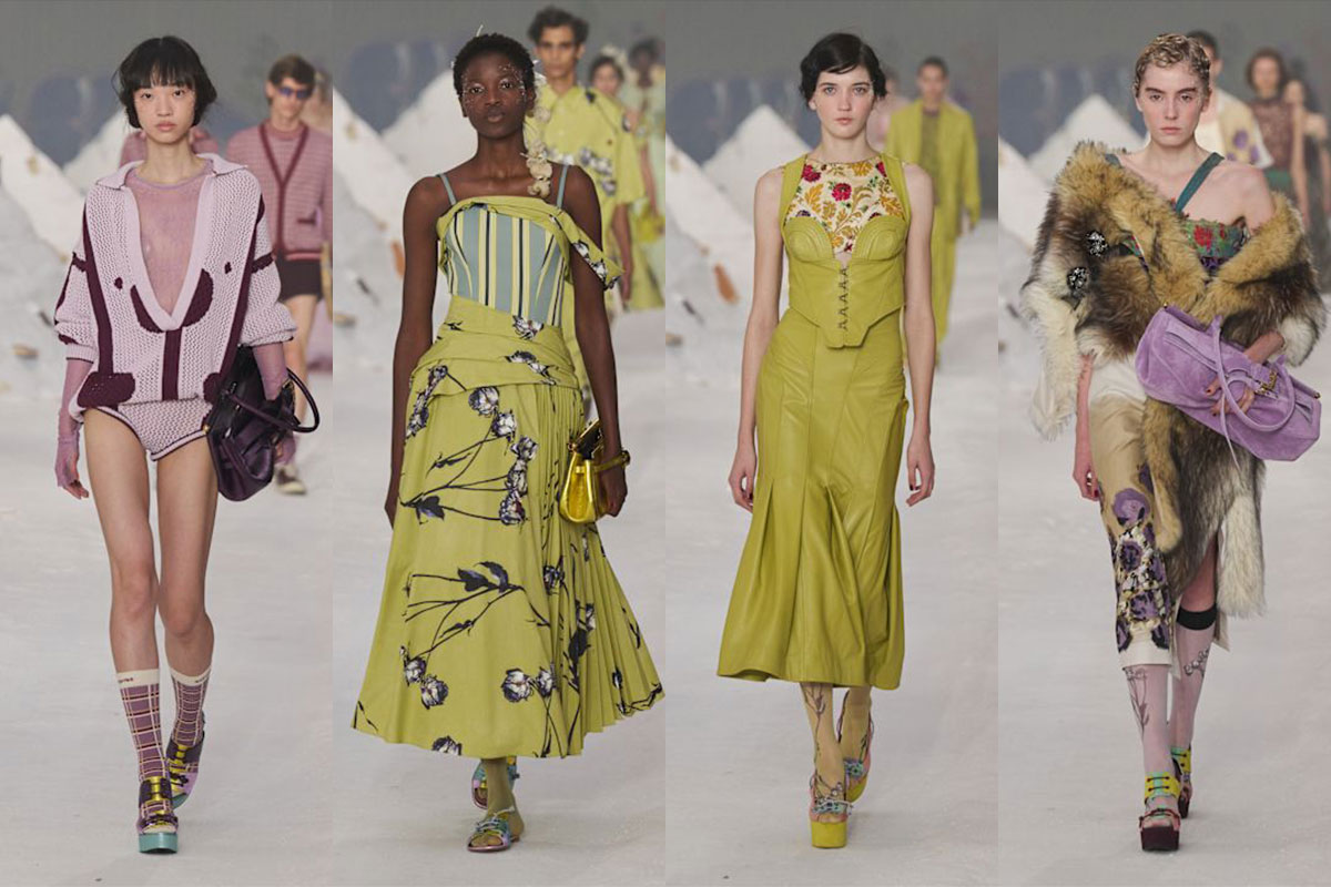 Auch die Accessoires spiegeln die Vielfalt wider: Metallic-Bags in Violett und Grün, Krokoprägungen und chunky Plateaus, die das Drama verstärken.
