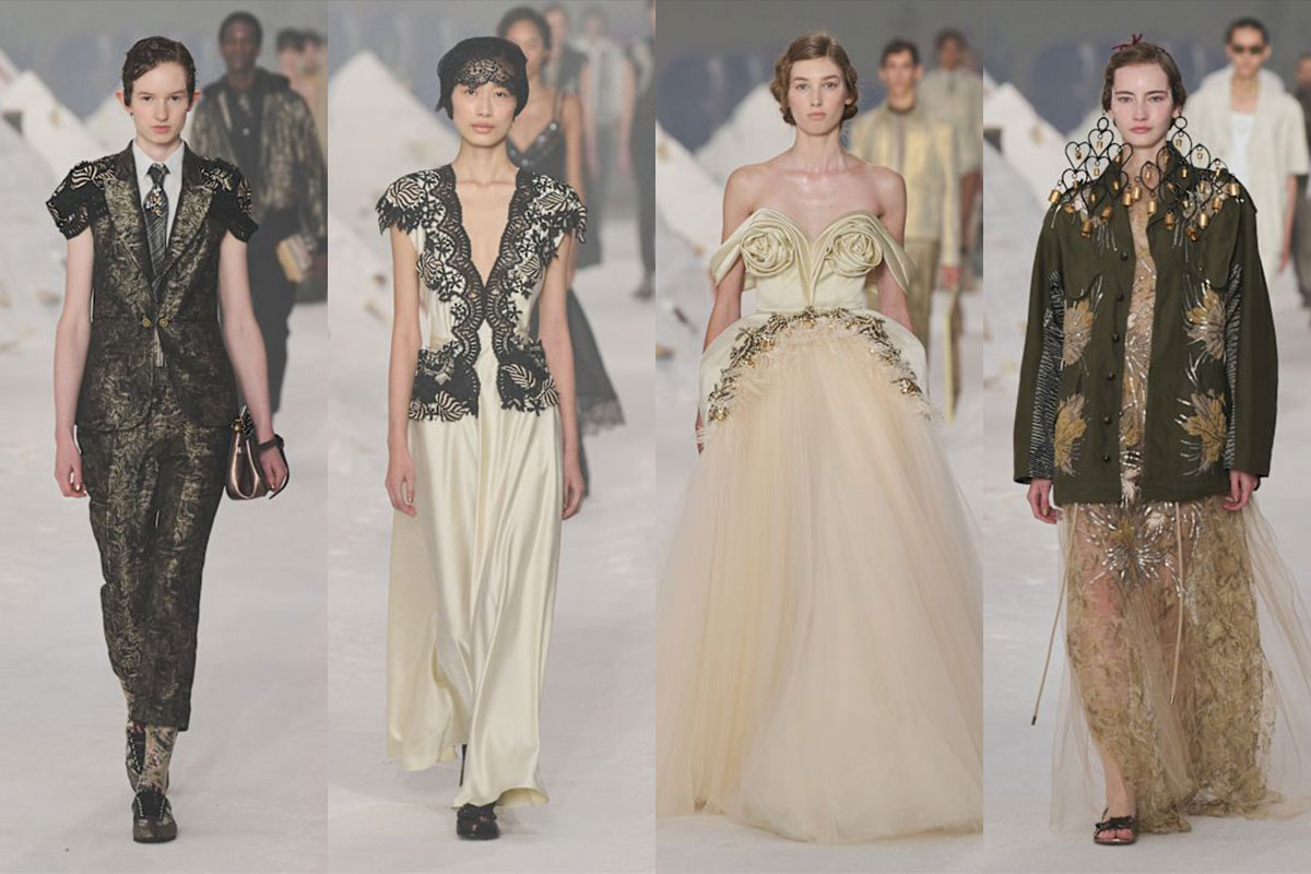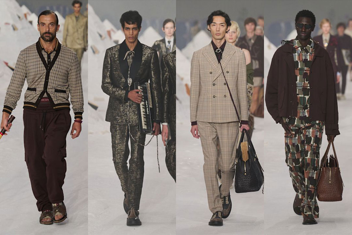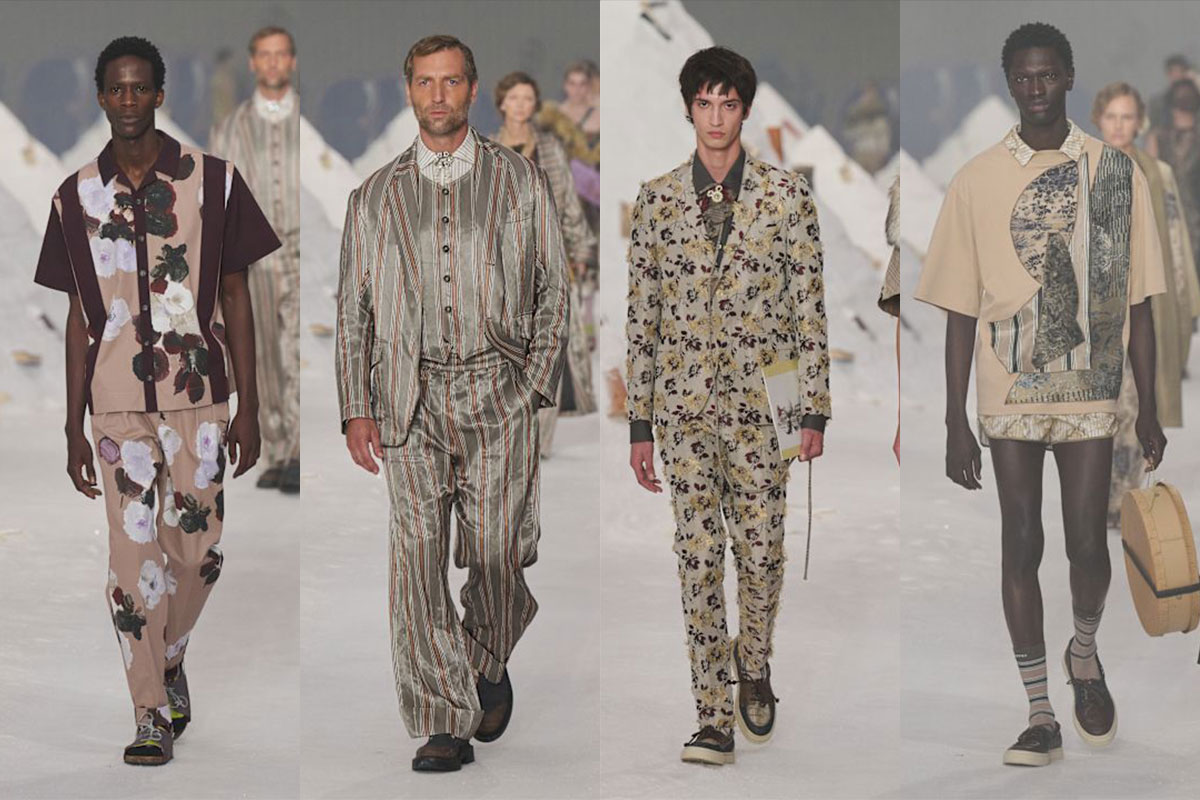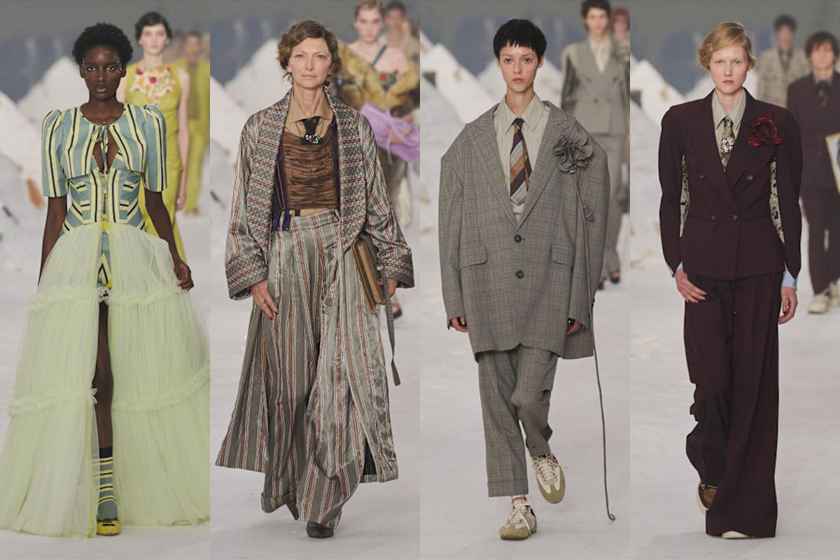 Marras liebt Kontraste: Karos mit Blumen, Streifen mit Damast, Spitze mit Kunstpelz – nie chaotisch, immer wie eine Symphonie. Die Silhouetten wechseln ständig: von Hollywood-würdigen Morgenmänteln zu Poirot-Roben, von Pyjama-Suits zu scharfem Tailoring, von besticktem Strick bis zu romantischen Abendkleidern. Männer und Frauen teilen Stoffe, aber in unterschiedlichen Schnitten interpretiert. Mit fast 100 Looks könnte das schnell zu viel wirken. Doch Marras’ Leidenschaft, Präzision und Talent, Gegensätze zu vereinen, machen daraus pure Fashion Poetry – fesselnd, bewegend, unvergesslich.