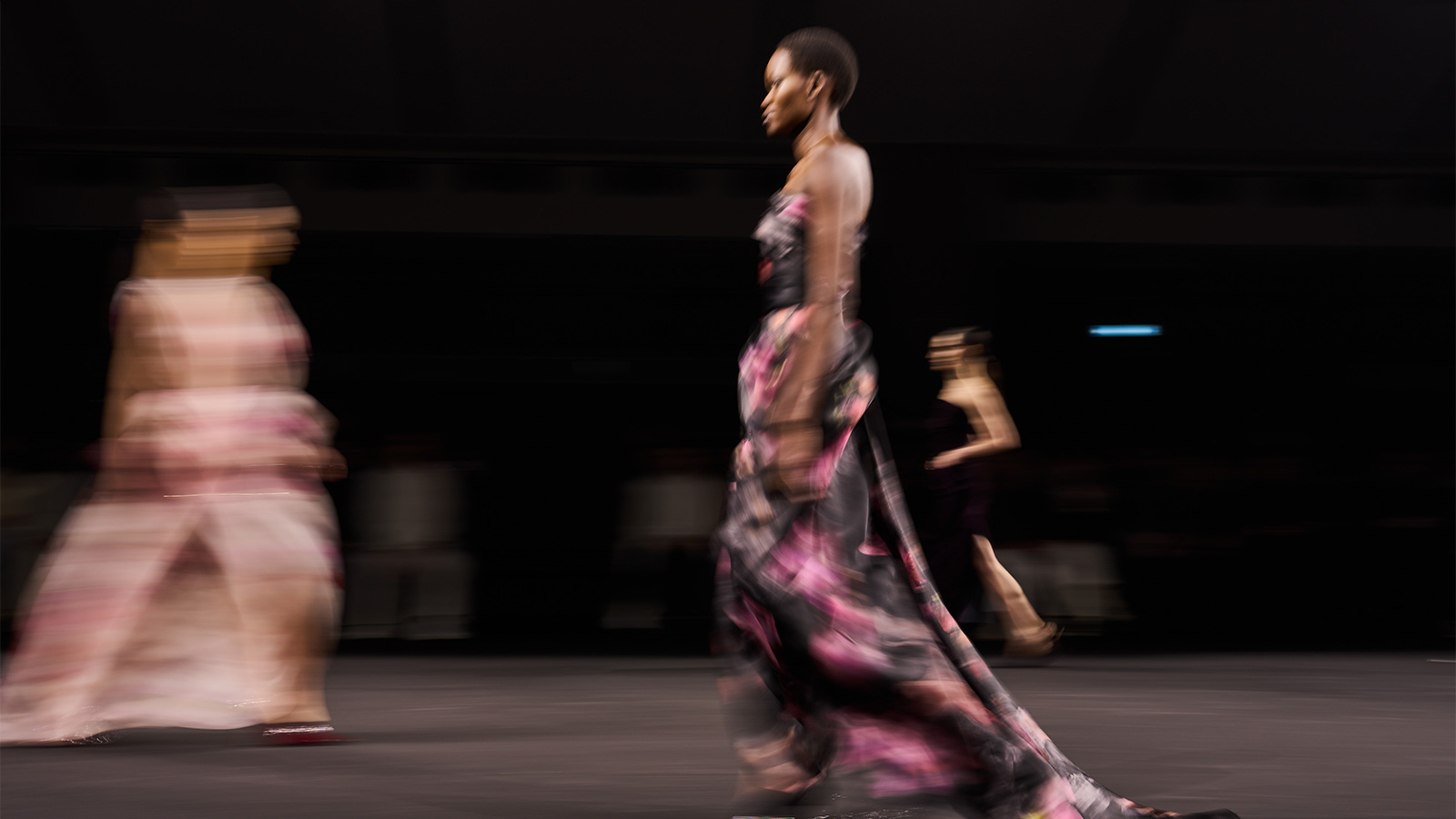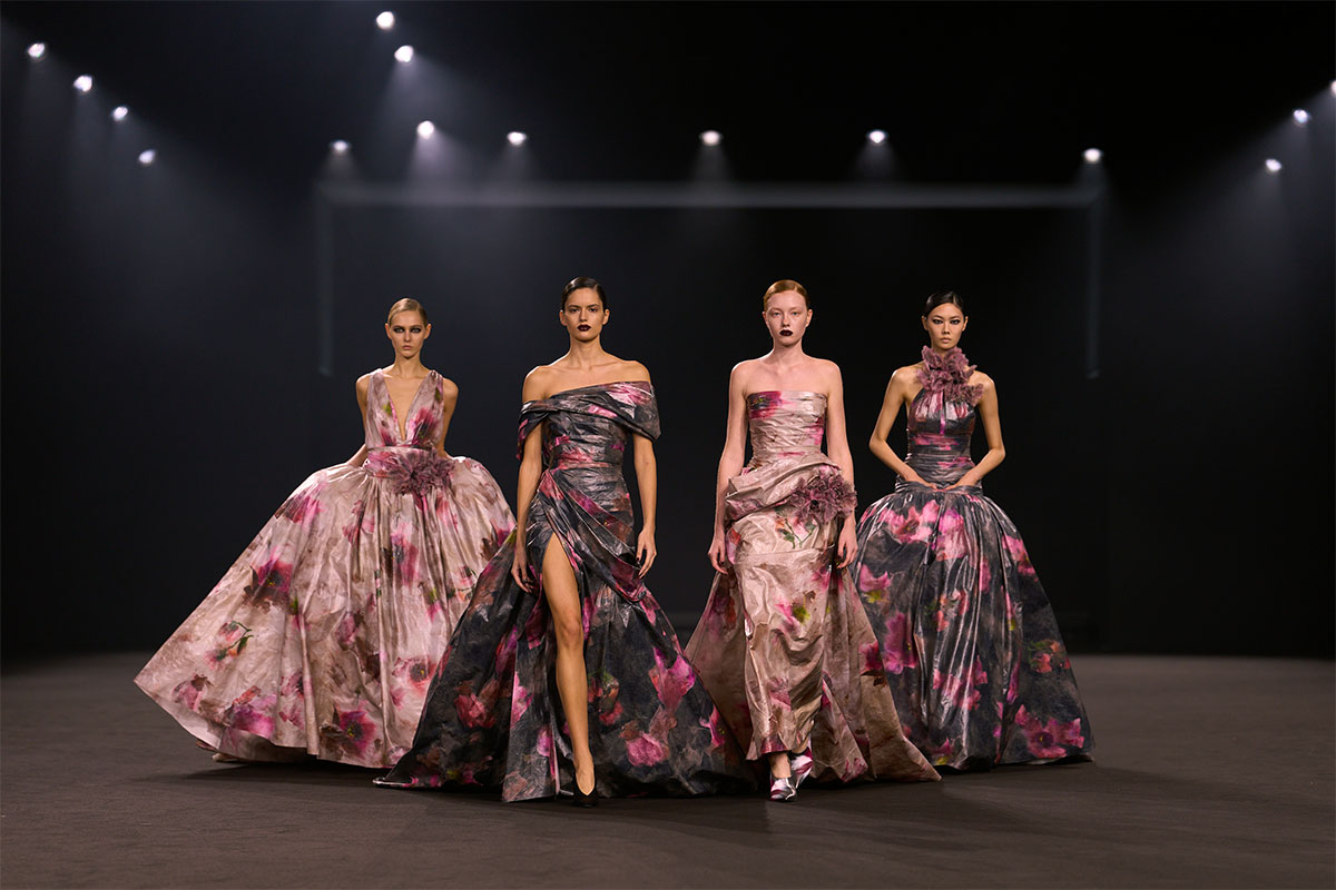 Dieser Struktur steht eine weichere, ausdrucksstärkere Seite gegenüber. Organza und Chiffon umspielen den Körper leicht, während Spitzen-Overlays die Sinnlichkeit der Stücke verstärken. Florale Motive, von Hand auf spiegelndes Leder gemalt, erinnern an die gestische Pinselschrift einer Künstlerleinwand. Die Krokodilstruktur taucht immer wieder auf – als poliertes Leder und erneut auf Pailletten-Tüll – und sorgt für Tiefe und Oberflächenspiel. Taftkleider mit figurbetonten Oberteilen und kurzen Puffröcken bringen skulpturales Volumen, während weite Ballkleider in stürmischen Farbtönen die Kollektion in eine beinahe filmische Abendstimmung führen. So spiegelt die Garderobe die kreative Spannung der New Yorker Kunstszene selbst wider – Disziplin trifft auf künstlerischen Ausdruck.