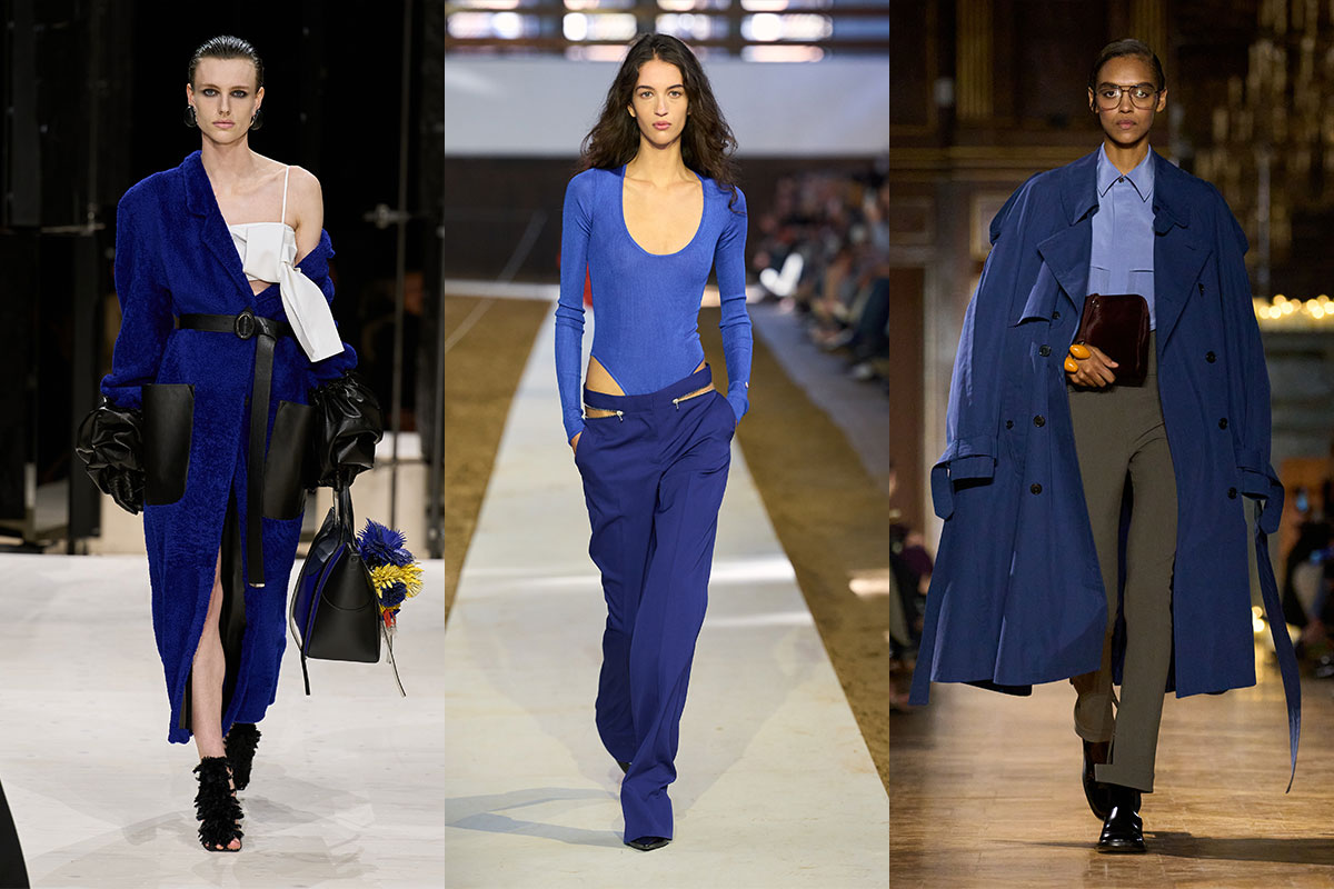 Nichts Subtiles hier: Auffälliges Blau kommt genau zur richtigen Zeit, nachdem der Carolyn-Bessette-Kennedy-Effekt uns kurzzeitig zurück zu Beige, Schwarz und Haarreifen getrieben hat.