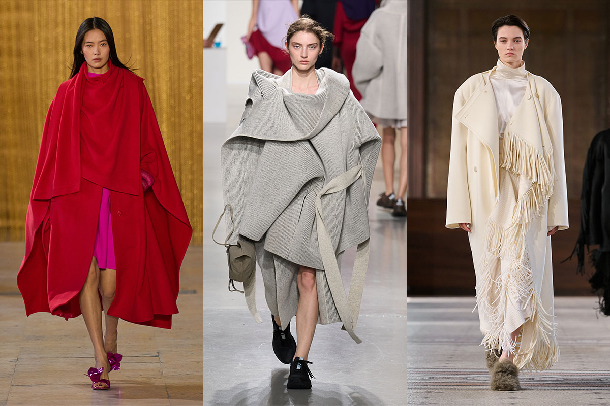 Capes, Cocoon Coats und skulpturales Draping: Das ist Konstruktion. Gewickelte, gefaltete, durchdachte Silhouetten bauen Volumen mit bewusst exzentrischem Charakter auf.