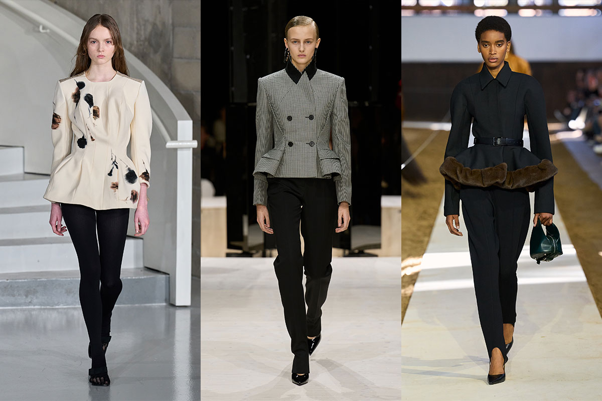 Peplum versucht seit Saisons zurückzukommen wie ein unerwünschter betrügender Ex. Diesmal gibt es sich aber mehr Mühe. Verschoben, off-centre, in Jacken und hybride Silhouetten eingebaut. Nicht die höfliche viktorianische Version — weniger vorhersehbar, disruptiver, aber trotzdem geschmackvoll.