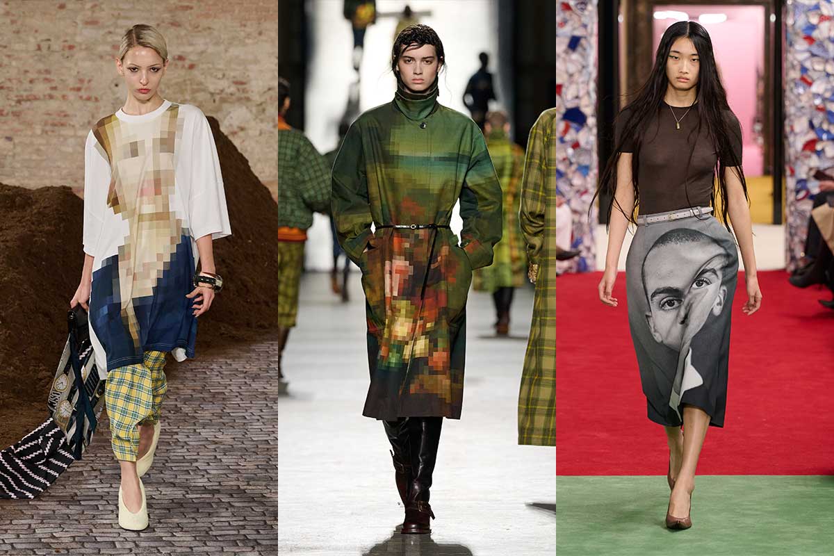 Hold my Espresso Martini — wir brauchen einen Rock mit dem Gesicht von jemand anderem drauf. Photo Prints werden skaliert, platziert und in die Kleidung integriert und versuchen sehr, sehr hart — oh so very hard — den Galliano Dior Newsprint Moment zu erreichen.