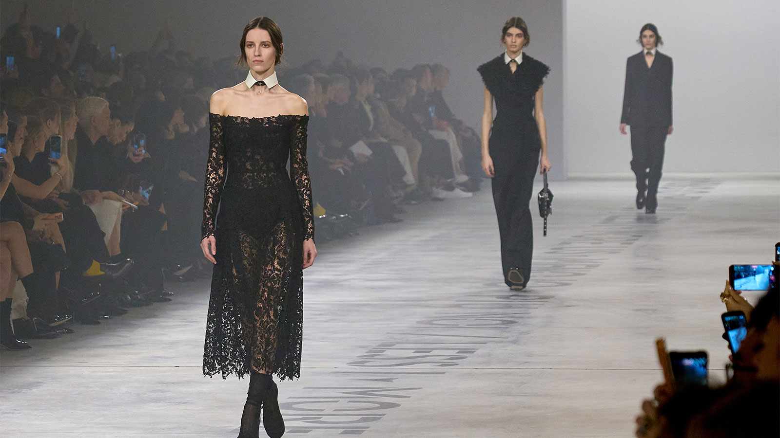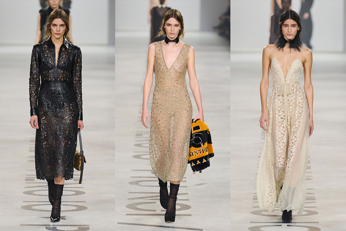 Die Womenswear ist geprägt von verlängerten Silhouetten und kontrollierten Proportionen. Spitze – traditionell mit Romantik verbunden – wird in schwarze Chantilly-Säulenkleider diszipliniert. Transparenz erscheint, aber nie lose; Leder-Einsätze strukturieren den Körper, während Choker den Hals rahmen. Das Zusammenspiel von maskuliner Strenge und femininer Feinheit erinnert an die Codes von Karl Lagerfelds Fendi. Pelz, zentral in Fendis DNA verankert, fasst Kragen und Gilets mit Zurückhaltung statt Übermaß ein. Abendlooks in Sand- und gedeckten Goldtönen wirken bewusst gesetzt statt dekorativ. Das Ergebnis ist eine Weiblichkeit, die durch Selbstsicherheit statt Fragilität definiert ist — unverkennbar Chiuri.