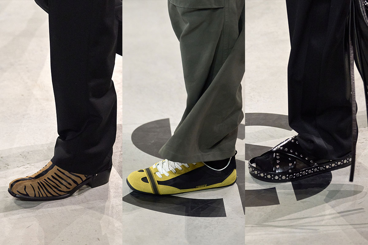 Die Menswear konzentriert sich auf Outerwear und präzises Tailoring. Anzüge sind schlank und verlängert geschnitten, nah am Körper, während Pelzmäntel Fendis materielle Tradition unterstreichen. Parkas und schwarze, maßgeschneiderte Overcoats bringen urbane Zurückhaltung ins Bild. Auf den ersten Blick wirkt die Stimmung fast reserviert. Doch das Detail liegt am Boden: Das Schuhwerk wird zum Statement. Zebra-gestreifte Stiefel, kontrastierende Low-Profile-Sneaker und genoppte Ledersandalen verschieben den Ton von klassisch zu disruptiv und brechen die Strenge des Tailorings.