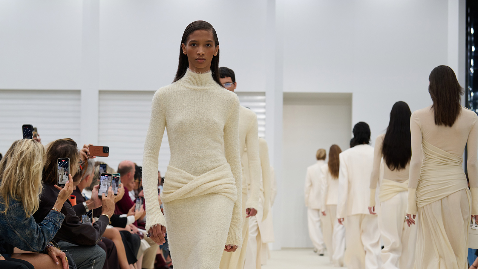 Ferrari SS26 startete auf einer weißen Leinwand: Silhouetten, die sich an klassischem Tailoring orientieren – fließend genug, um zwischen maskulin und feminin zu wechseln, aber trotzdem mit klarer Definition. Verlängerte Jacken gleiten über Hosen, transparente Layering-Elemente nehmen der Strenge die Härte, und eine Palette aus reinem Weiß und Buttertönen unterstreicht die Klarheit der Linien – Mode reduziert auf Form und Bewegung.
