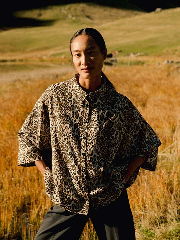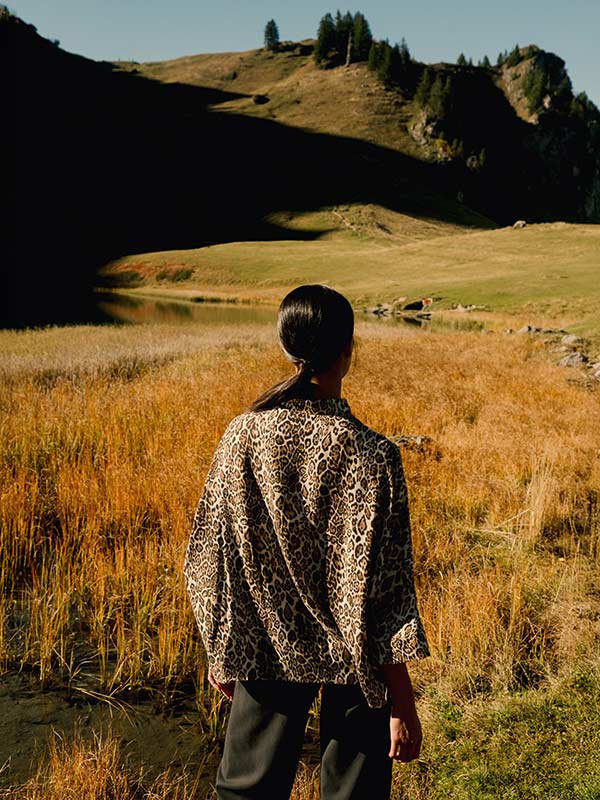 Aus diesem Material entstanden vier eigenständige Prints, die Zambon zu textilen Mustern weiterentwickelten. Die Motive wurden auf GOTS-zertifizierte Bio-Peace-Silk gedruckt, also gewaltfreier Seide, bei der die Raupen als Falter schlüpfen dürfen. Anschließend verarbeitete das Team in Thun und im Tessin die Stücke zu One-Size-Blusen. Diese wurden so geschnitten, dass sie möglichst vielen Menschen, unabhängig von Größe und Figur, passen.