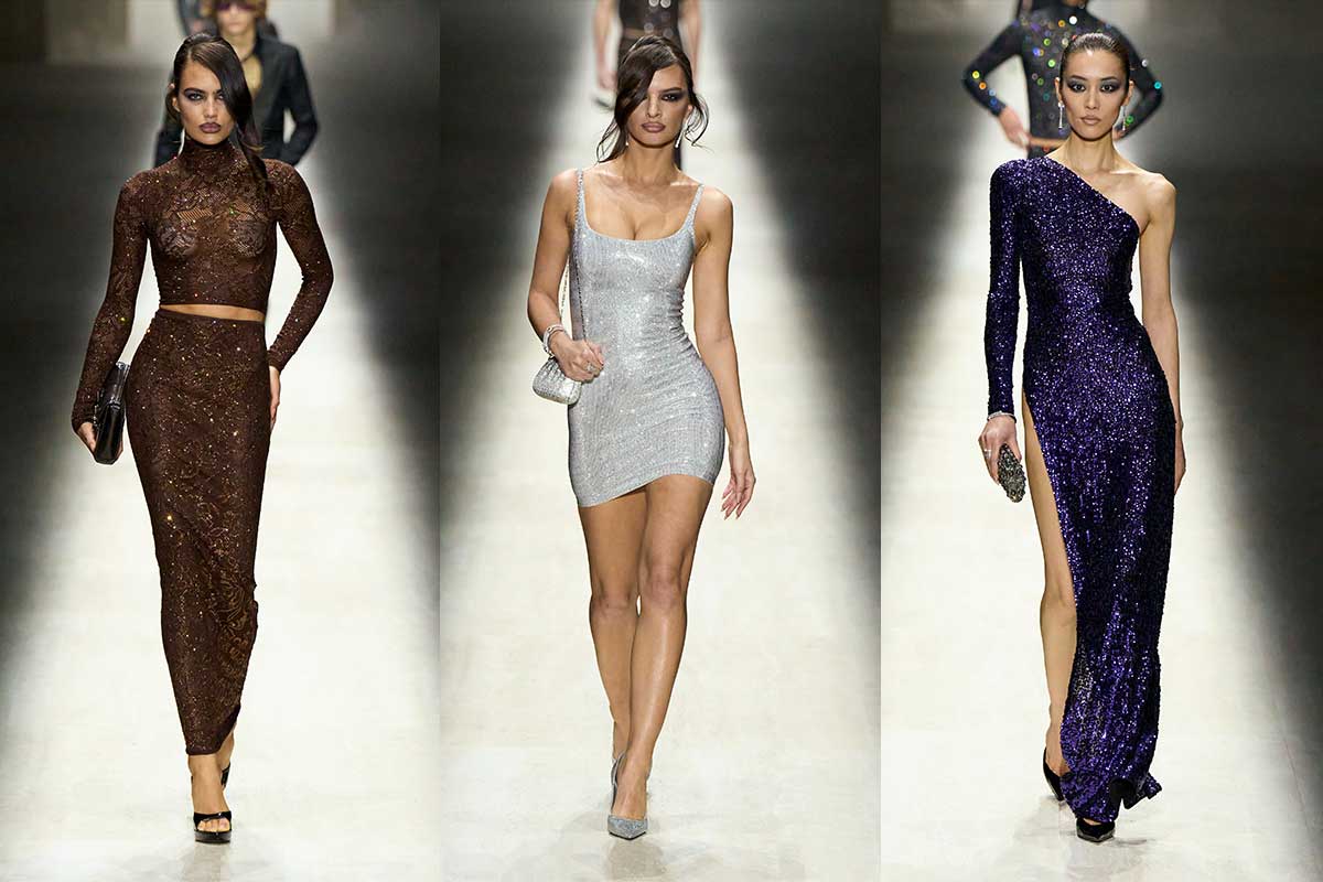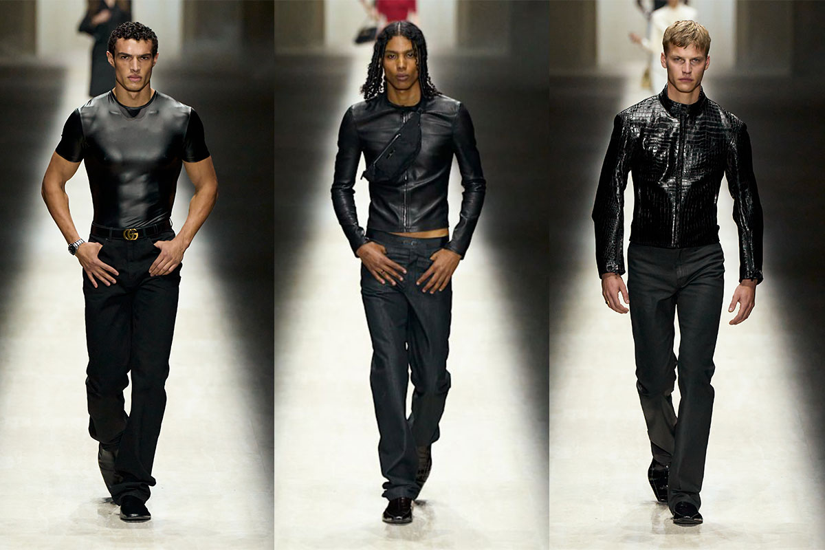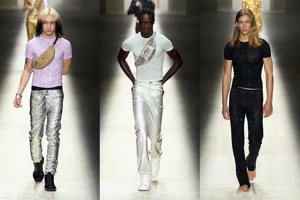 Die Womenswear ist kompromisslos körperbetont. Die Silhouetten sitzen tief auf der Hüfte, liegen wie eine zweite Haut am Körper. Strick, taillierte Lederjacken und schmale Hosen zeichnen die Linie nach und strecken die Figur. Über Stoffe und Schnitte kommt eine leichte Verschiebung rein: Unerwartete sportliche Details und technische Finishes brechen den Look, ohne ihm den Glamour zu nehmen. Florale Prints erscheinen in dramatischen Kleidern, während ein leichteres Slipdress die Intensität etwas abfedert. Volumen kommt punktuell. Faux Fur explodiert an Krägen, Bombern und Statement-Mänteln und trifft auf extrem schmale Basics. Croc-Glanz und glattes Leder verstärken den polierten Effekt. Am Abend wird es noch direkter. Skulpturale Kleider schmiegen sich an den Körper, Cut-outs betonen die Taille, Pailletten-Säulen funkeln mit Nachdruck. Sex Appeal – bewusst inszeniert und klar konstruiert.