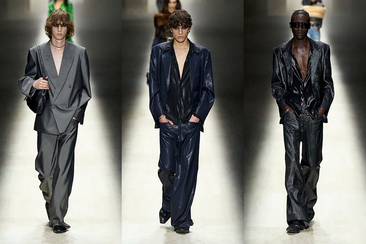 Die Menswear schärft die Silhouette und verstärkt eine modellierte Maskulinität. Körperbetonte Tops, kurze Jacken und schmale Hosen sorgen für eine vertikale, brustbetonte Haltung. Dunkle Töne dominieren – Schwarz, Anthrazit, tiefes Navy – kurz unterbrochen von hellen Metallics, bevor die Stimmung wieder ins Nächtliche kippt. Im Tailoring wird es etwas lockerer: weichere Schultern, längerer Fall, minimal weitere Hosenbeine. Sinnlichkeit, aber in Struktur gehalten.