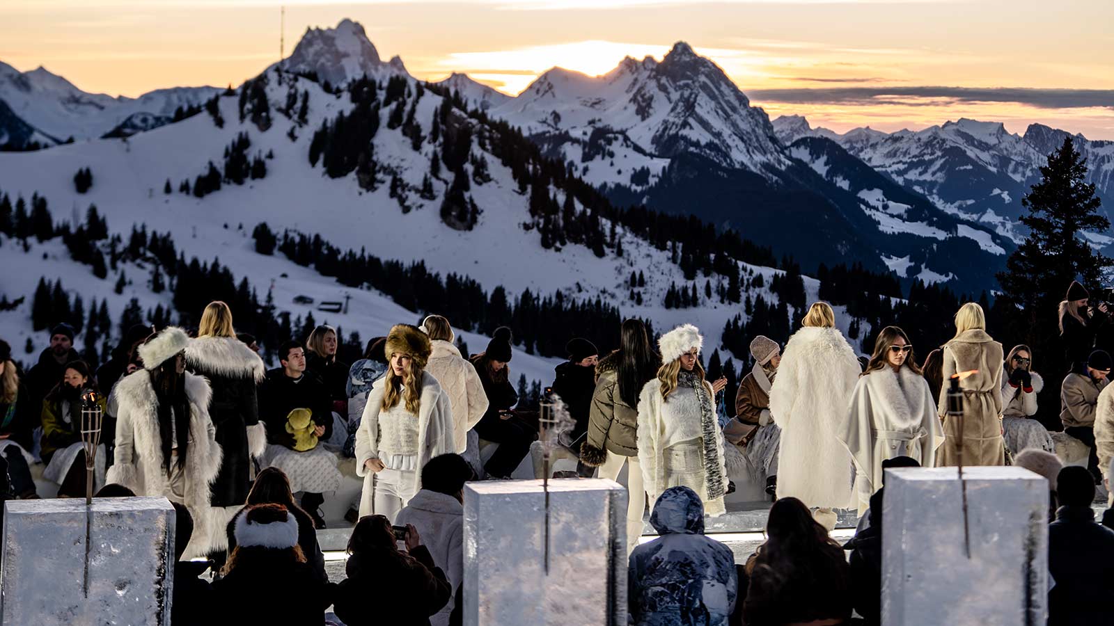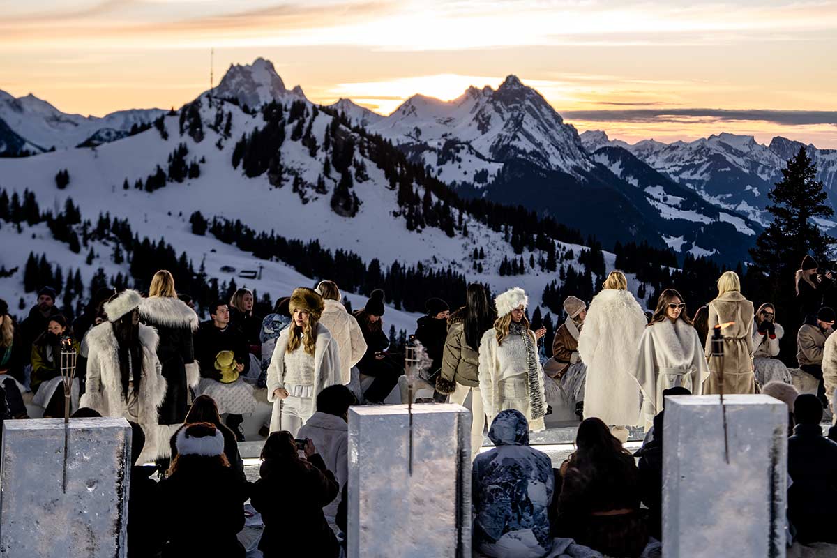 Das immersive Laufsteg-Erlebnis integrierte das malerische Setting bewusst ein und faszinierte damit rund 60 geladene Gäste, unter denen sich InfluencerInnen und VertreterInnen der europäischen Presse wie Chiara Ferragni, Leonie Hanne und Lea Elui befanden. Zum Sonnenuntergang verlieh die Live-Performance der Violinistin Laura Zimmermann dem Abend im charmanten Chaletdorf eine filmische Note