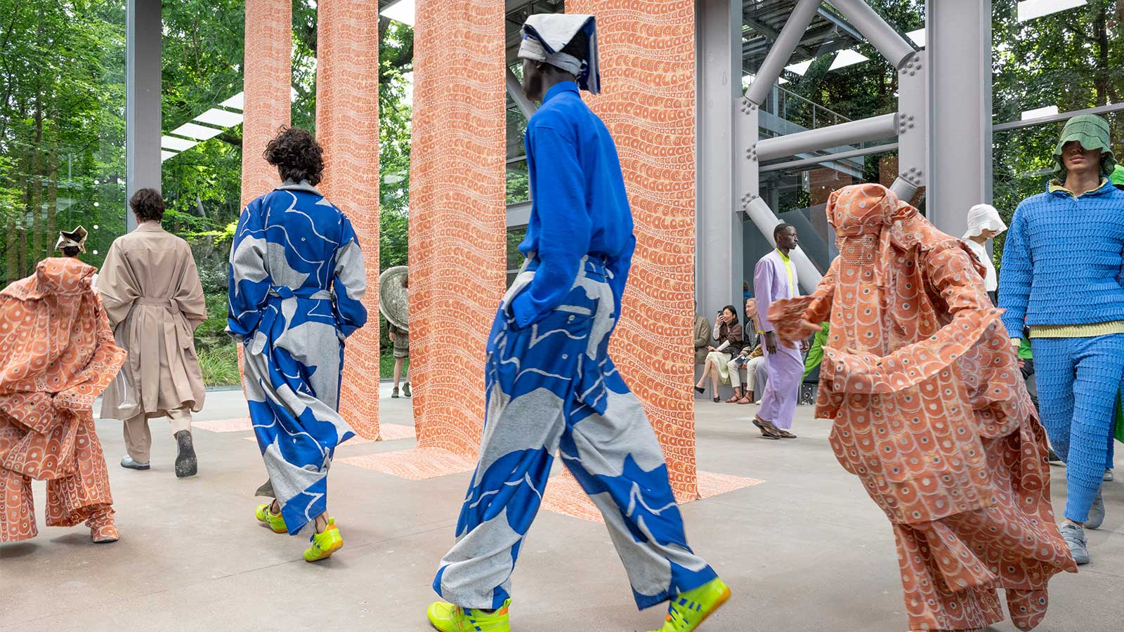Unter dem durchfluteten Glasdach der Fondation Cartier in Paris verwandelte Issey Miyake seine Präsentation der IM MEN Frühjahr/Sommer 2026 Kollektion in ein atmosphärisches Gesamtkunstwerk. „Dancing Texture“ war der Titel – und genau das geschah: Eine stille Choreografie aus Licht, Luft und Bewegung bei der Performer zwischen schwebenden Stoffbahnen agierten, während das Material selbst zu atmen schien.