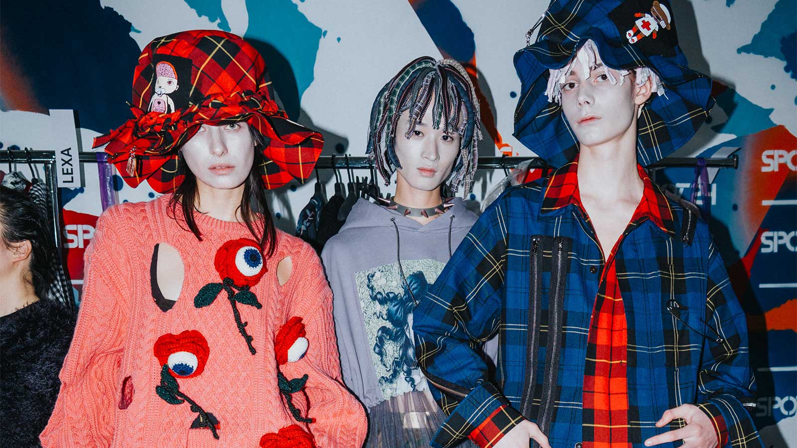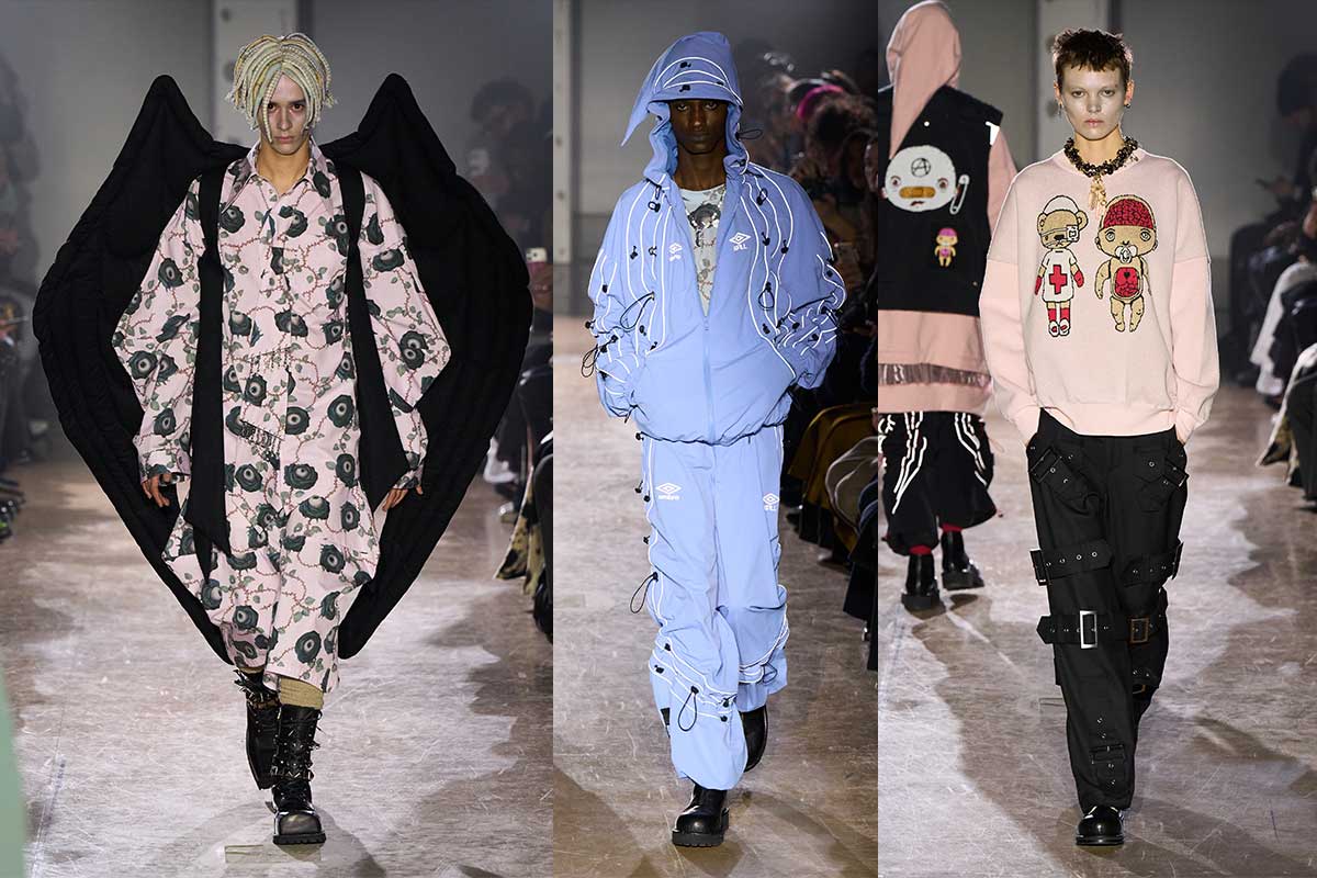 Die Herbst/Winter-Kollektion 2026/27 beginnt mit gedämpften Tönen, einer Farbpalette, die von Schwarz über rauchige Grautöne zu staubigen Blautönen und blassen Rosatönen übergeht. Vor diesem sanften Hintergrund erscheinen überdimensionale Teufels- und Engelsflügel – übertrieben groß, fast zeremoniell – und schaffen einen Dialog zwischen gegensätzlichen Zuständen statt einer einzigen Stimmung. Die visuelle Sprache des Punk bleibt erhalten. Tartan, seit langem in der subkulturellen Kleidung verankert, zieht sich durch Hosen, Mod-Mäntel und Kopfbedeckungen, während Bondage-Riemen, Sicherheitsnadeln und Metallverzierungen die Rohheit im Kern des Hauses bewahren. Kunstwerke von Trevor Brown sind direkt auf die Kleidungsstücke aufgebracht und verankern die Kollektion in der Underground-Kultur Tokios. An anderer Stelle kontrastieren Tülllagen mit gesteppten Röcken, Hosen und Bomberjacken und verleihen den auf Gewicht und Volumen basierenden Silhouetten Leichtigkeit.
