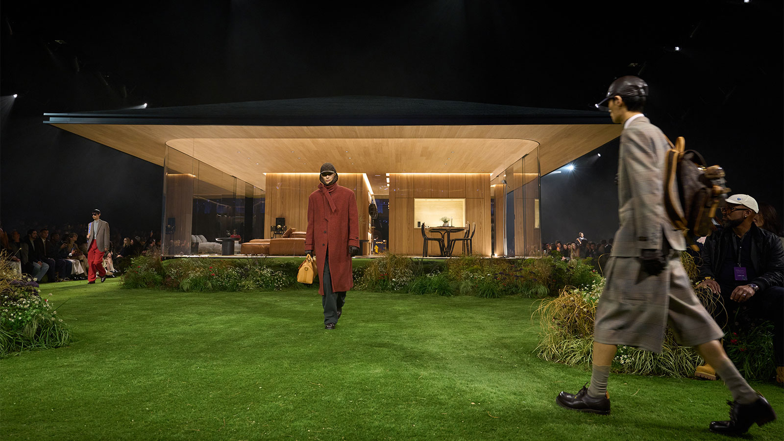 Die neue Louis Vuitton Menswear Kollektion wurde im Schatten der Fondation Louis Vuitton präsentiert – und lieferte die eigene Bleibe gleich mit. Die Laufstegshow fand rund um Pharrell Williams‘ „Drophaus” statt, einem eleganten Fertighaus, das in Zusammenarbeit mit dem Architekturbüro Not A Hotel entstanden ist. Ein Ort, von dem viele träumen, an dem sie aufwachen möchten, ein Raum fernab von Routine und Konformität. Die Kulisse fungierte sowohl als Bühne als auch als Symbol. Sie flüsterte die Sprache des Alltags, jedoch geprägt von poetischer Intellektualität. Das Resultat war ein moderner Nomadismus, ausgedrückt durch Sanftheit statt Kraft, emotionale Kompetenz statt roher Männlichkeit und stille Autorität statt Lärm.