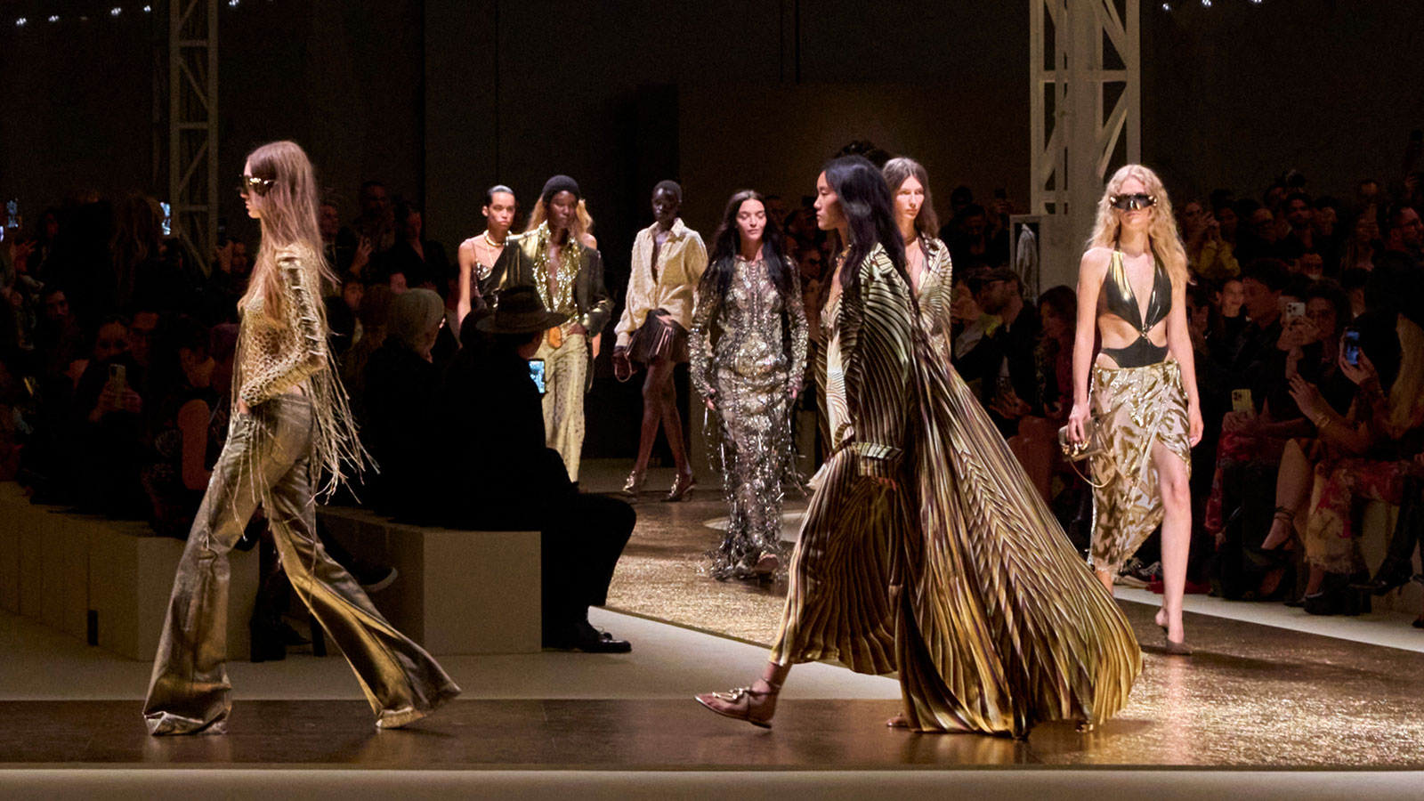 Diese Saison wirkt, als würde Puglisi noch tiefer in seine eigene Cavalli-Sprache eintauchen – ein Shift hin zu softer Verführung und vergoldeter Leichtigkeit, aber immer verankert in furchtloser Sinnlichkeit. Gold Obsession ist das Thema: ein Ton, der schnell nach Vegas-Kitsch kippen könnte, den Puglisi aber mit Finesse balanciert. Lamé, Folie, schimmerndes Denim und vergoldete Spitze treffen auf fließende Kleider versus strenge Schnitte – Metallic-Jeans zu Python-Blusen.