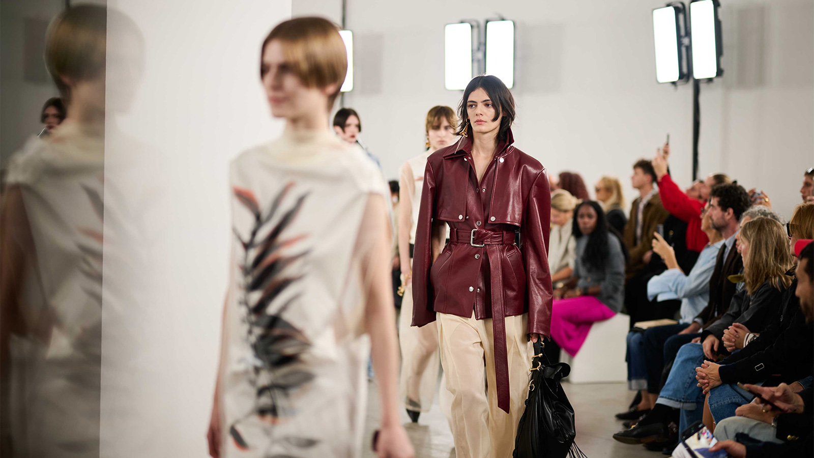 Organza bestimmt die Saison, nicht mehr bloß Deko, sondern ein echtes Konstruktions-Tool. Trenchcoats bekommen spektrales Volumen, transparente Hosen halten ihre Form, und ultraleichte Futter verändern die Sprache des Tailorings. Satin gleitet als fließende Kleider über den Körper. Leder bringt Struktur in kurze Trenches, lange Mäntel und ärmellose Gilets, während doppelter Denim weich und easy wirkt.