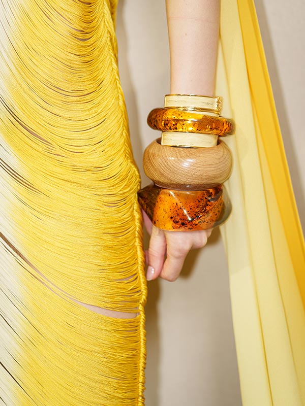 Ein auffälliger Armreif alleine ist bereits ein gutes Statement Piece. Viel besser wird es, wenn mehrere davon aufeinander geschichtet werden. Dann klimpert es so schön bei jeder Bewegung, dass man von Weitem hört, dass eine modebewusste Person daher schreitet. Und natürlich sieht der dekorierte Arm umso spannender aus, je wilder man sich bei allen möglichen Ästhetiken, Farben und Formen bedient.