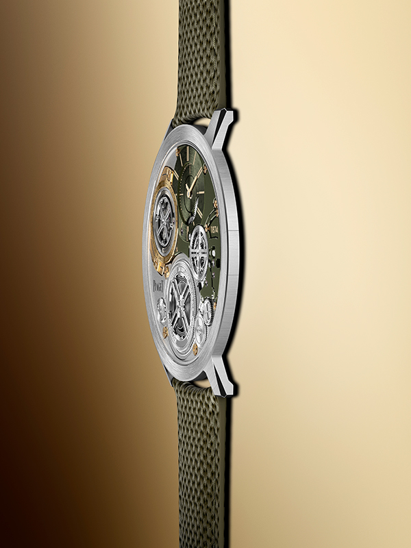 Je dünner, desto besser. Was in der Mode zurecht als problematisches Motto gilt, hat im Design eine ganz andere Bedeutung. Komplexe Uhrwerke in millimeterdünne Gehäuse einzubauen, bleibt eine spannende Herausforderung in der Welt der Haute Horlogerie. Das iPhone mag mit jedem Release größer werden, doch die Uhren können mit dieser Design-Denkweise wenig anfangen. Zwei neue Modelle in Gold und Khaki-Grün von Piaget beweisen, dass es immer noch einen Schritt schlanker und eleganter geht. Mit der Einführung des legendären 9P Uhrwerks im Jahr 1957, gefolgt vom 12P im Jahr 1960, hat Piaget den Standard für ultraflache Uhren gesetzt. Auf 2025 übersetzt heißt das: Die Altiplano Ultimate Concept Tourbillon ist 2 Millimeter dünn, die Altiplano 910P 4,3 Millimeter. Die auserlesenen Farben und Details verraten: Goldschmiedekunst und Uhrmacherkunst verschmelzen bei Piaget. piaget.com