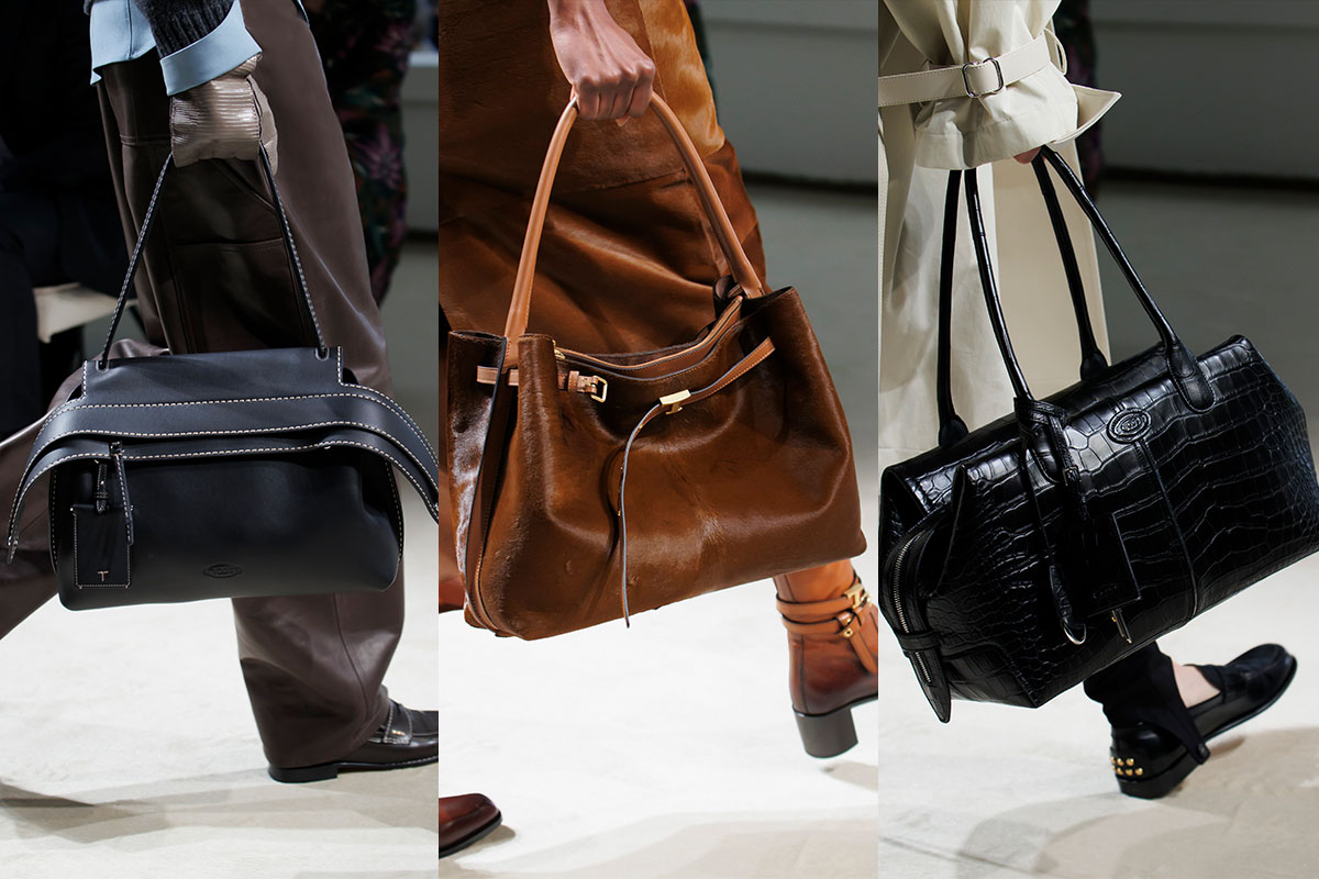 Die ikonischen Taschen entwickeln sich mit Zurückhaltung weiter. Die Wave Bag wird durch markantes Sattler-Topstitching geschärft. Die T Timeless erscheint in Nappa, gealtertem Kalbsleder oder Pony. Die Di Bag zeigt sich in einer strukturierten Bowling-Silhouette.