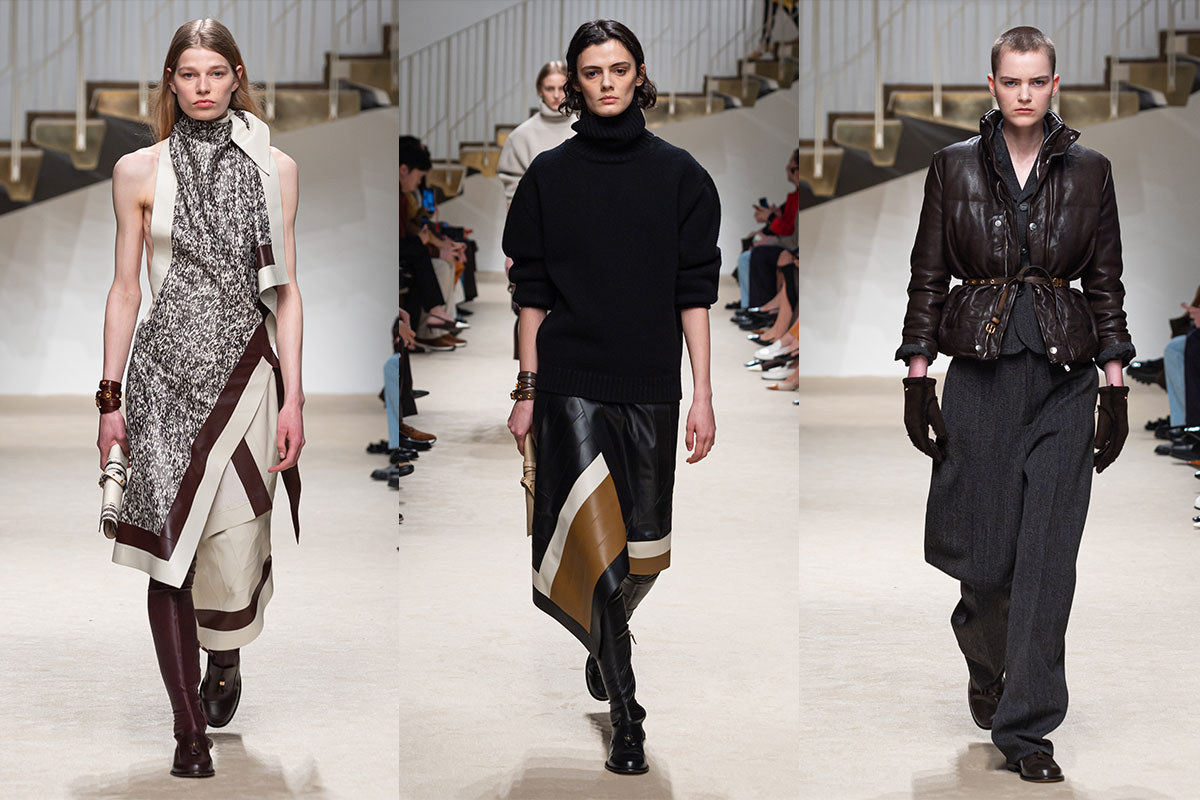 Pashmy (federleichtes Kalbsleder) zieht sich durch Mäntel, Röcke und Hosen und mildert die Strenge, ohne an Autorität zu verlieren. Die Farbpalette bleibt diszipliniert: Karamell, Ingwer und Schokolade, gebrochen durch klares Schwarz und Weiss.