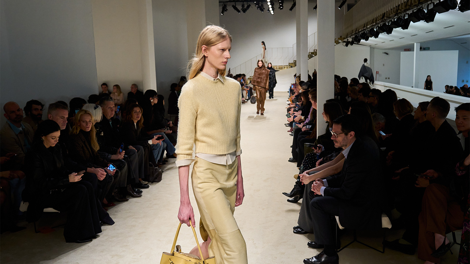 Pashmy (federleichtes Kalbsleder) zieht sich durch Mäntel, Röcke und Hosen und mildert die Strenge, ohne an Autorität zu verlieren. Die Farbpalette bleibt diszipliniert: Karamell, Ingwer und Schokolade, gebrochen durch klares Schwarz und Weiss.