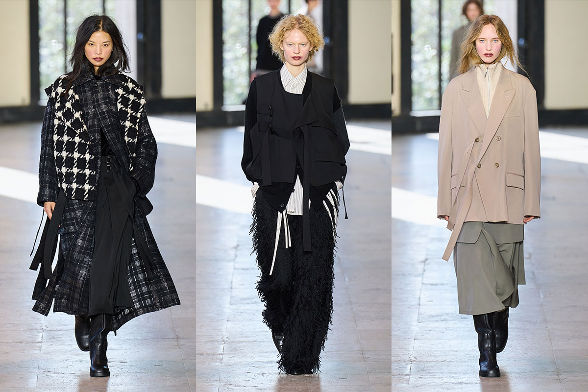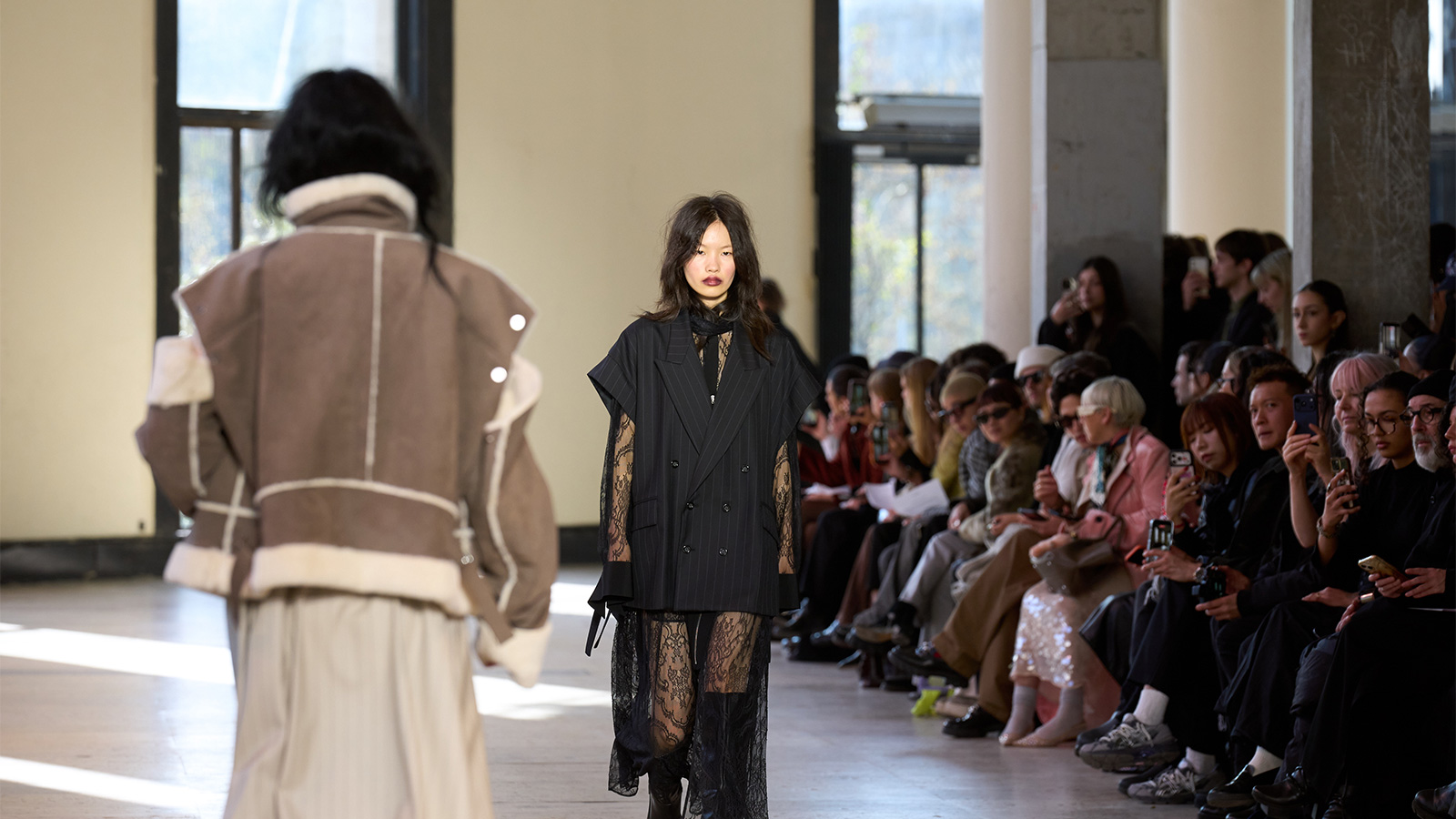 Die Kollektion rund um die Idee der Antithese auf: Struktur trifft auf Weichheit, Disziplin auf Leichtigkeit. Die Präzision im Schnitt bleibt sichtbar, doch die Silhouetten wirken entspannter und bewegen sich zwischen Eleganz und einer leichten Unordnung. Materialien spielen dabei eine zentrale Rolle. Einige Stoffe werden in Japan auf einem Schönherr-Webstuhl aus den 1960er-Jahren gefertigt, der fünfmal langsamer arbeitet als moderne Maschinen und den Textilien eine dichte, fast greifbare Qualität verleiht. Faux-Suede und Faux-Fur erscheinen in Aviatorjacken, während Spitze überraschend unter strukturierten Layers auftaucht. Karomuster bringen einen subtilen 90er-Grunge-Vibe hinein, und eine dunkle Palette aus Schwarz, Schokolade und Rosenholz wird von Akzenten in Farn-Grün und Feige aufgelockert.