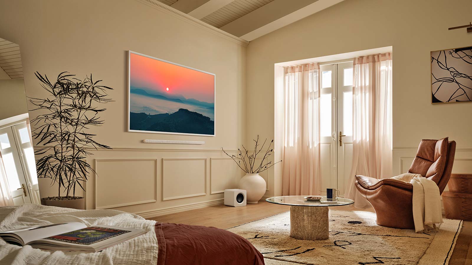 Bei Samsung finden alle, die Filme lieben, den Look eines Fernsehers hingegen weniger, das perfekte Stück. The Frame Pro sieht auf den ersten Blick aus wie ein Gemälde. Wer eine sogenannte Gallery Wall bei sich an der Wand hat, kann ihn also einfach dort integrieren. NutzerInnen können den Wechselrahmen in verschiedenen Farben wählen und im Samsung Art Store aus 3’500 Werken berühmter KünstlerInnen und Galerien in 4K-Qualität auswählen – schon wird aus dem Fernseher ein Stück Kunst. The Frame Pro lässt sich außerdem mit der kabellosen One Connect Box verbinden, was ihn noch mehr wie ein Kunstwerk wirken lässt.