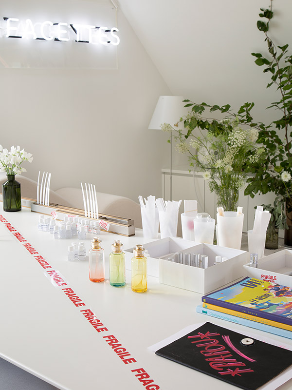 Das neue Labor liegt im Herzen des sogenannten „goldenen Dreiecks“ von Paris – zwischen der Rue du Faubourg Saint-Honoré, der Avenue Montaigne und dem Place Vendôme. Laurent hat das Atelier selbst gestaltet, und das ist spürbar. Die Räume wirken ruhig, hell und persönlich. Unter den weißen Dachschrägen von Paris liegt ein Ort, der zugleich Arbeits- und Lebensraum ist. Schlichte Möbel, natürliche Formen – an einer Wand tritt eine Gipsnase hervor, ein Abguss aus der Sammlung des Musée des Arts décoratifs – eine humorvolle Referenz an die Kunst des Riechens.