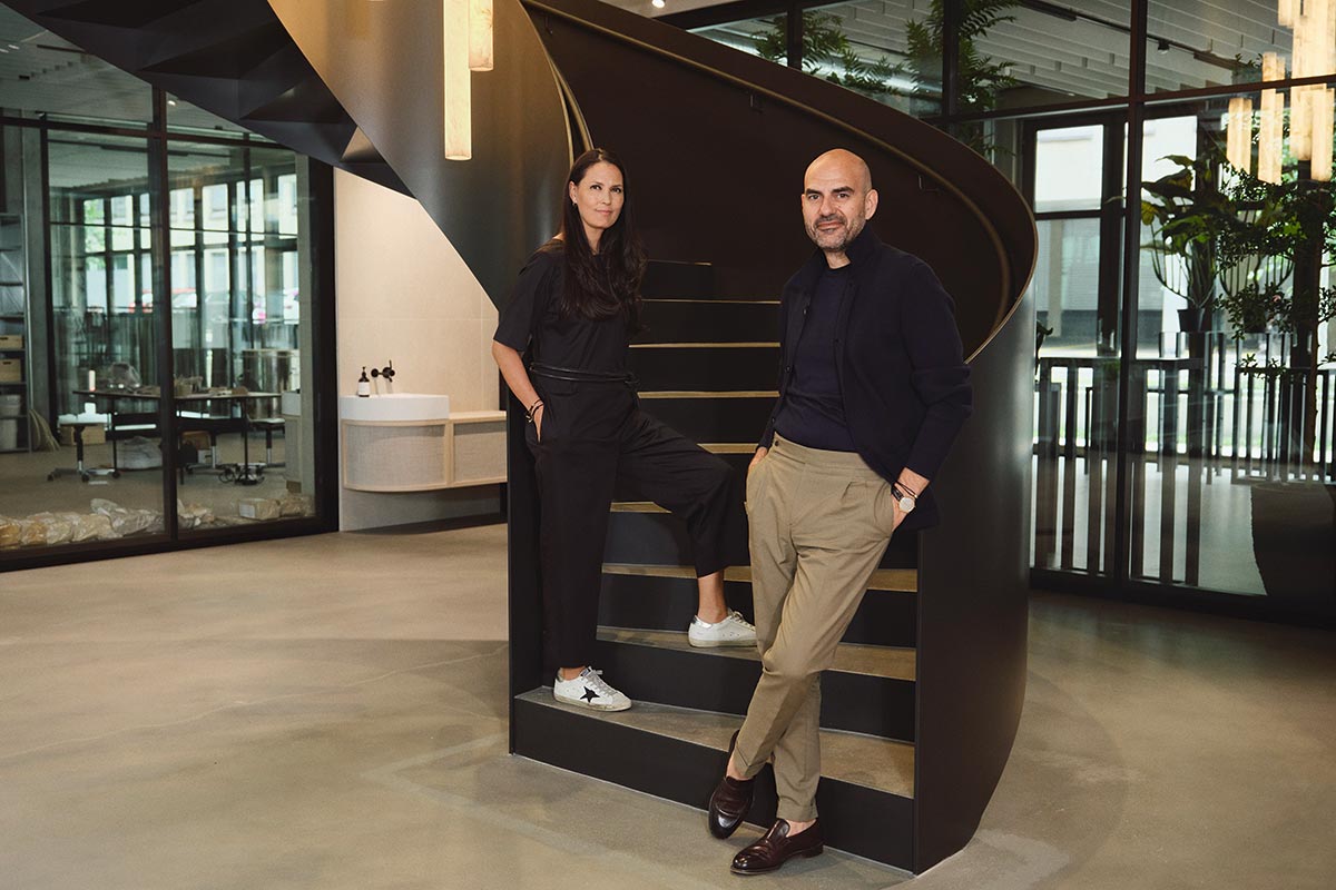 Ein besonderer Moment war der spektakuläre Eingriff in die Bausubstanz: „Wir mussten ein 4,5 m großes Loch in den Beton fräsen, damit wir unsere eigene innenliegende vertikale Verbindung zwischen den beiden Stockwerken haben. Das war ein riesiger Akt und sicherlich auch die größte bauliche Intervention, die wir hier vollzogen haben. Als dieses riesige ‘Kuchenstück’ aus dem Beton herausgeschnitten wurde, habe ich beim Zuschauen Gänsehaut bekommen.“ Heute verbindet eine skulpturale Wendeltreppe die Piazza oben mit den Ateliers unten: „Sie ist eine Pausenzone für die ganze Community – das Herzstück des House of Interiors.“