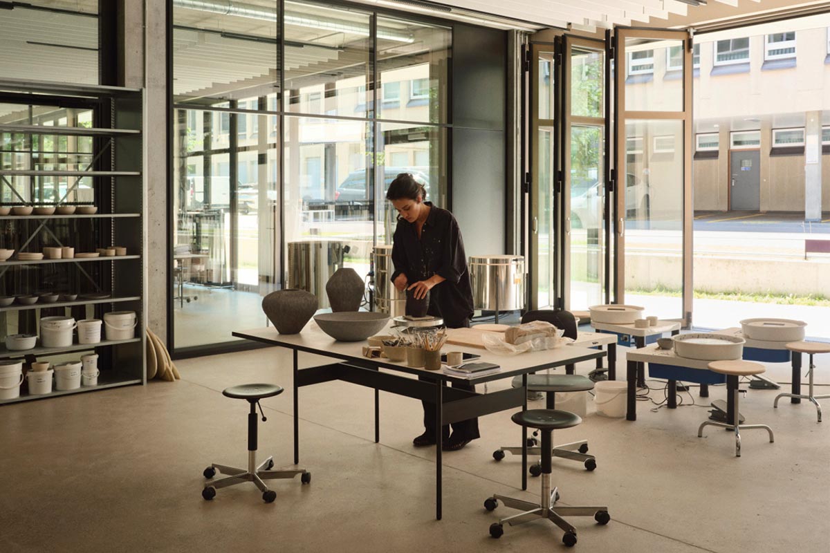 Mitten in den lichtdurchfluteten Hallen entstehen Möbel, Textilien, Kunstobjekte und Interior-Konzepte. „Planung und Produktion an einem Ort miteinander zu verbinden, verkürzt Wege, fördert Synergien und stimuliert Kreativität“, erklärt Iria Degen, die Schweizer Interior Designerin hinter dem Projekt. Gemeinsam mit ihrem 15-köpfigen Team hat sie das House of Interiors an der Grubenstrasse 6–8 bezogen.