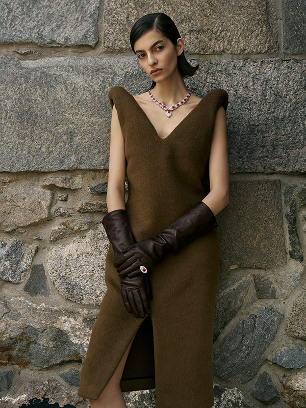 Rechte Seite: Schmuck von CARTIER HIGH JEWELLERY. („Arcata“ Collier und Ohrringe aus Weißgold, Rubelliten und Diamanten) Kleid von BOTTEGA VENETA (Archive). Handschuhe von ROECKL