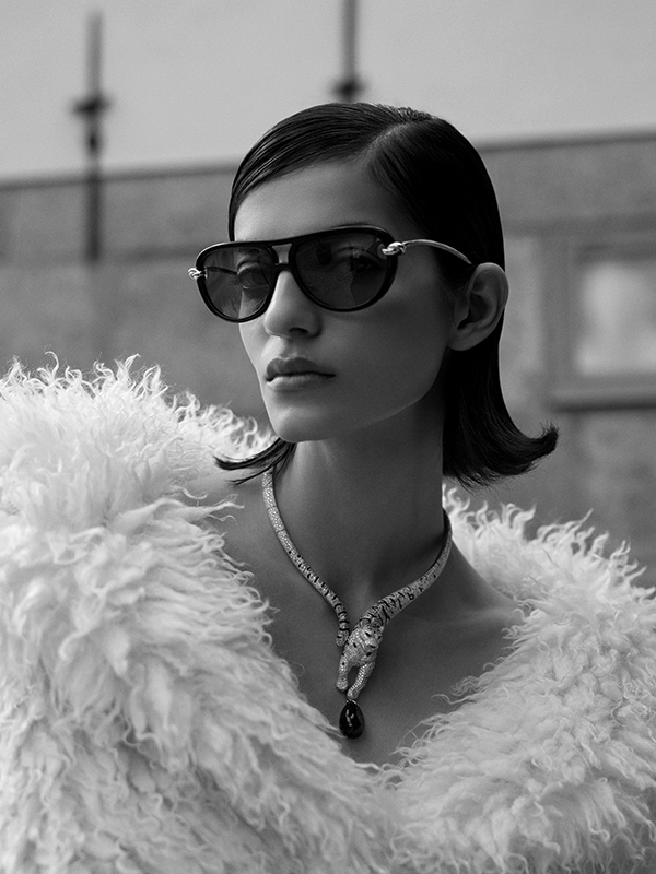 Schmuck von CARTIER HIGH JEWELLERY. („ Green Tigre de Siberie“ Collier aus Gelbgold, Smaragden, Onyx und farbigen Diamanten) Jacke von MICHAEL MICHAEL KORS. Sonnenbrille von BOTTEGA VENETA.
