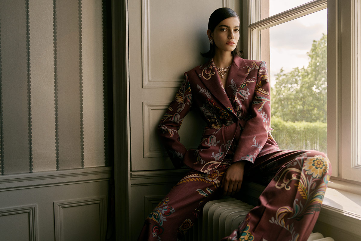 Schmuck von CARTIER HIGH JEWELLERY. („Hyala“ Collier und Ohrringe mit farbigen Diamanten und Saphiren) Anzug von ETRO.