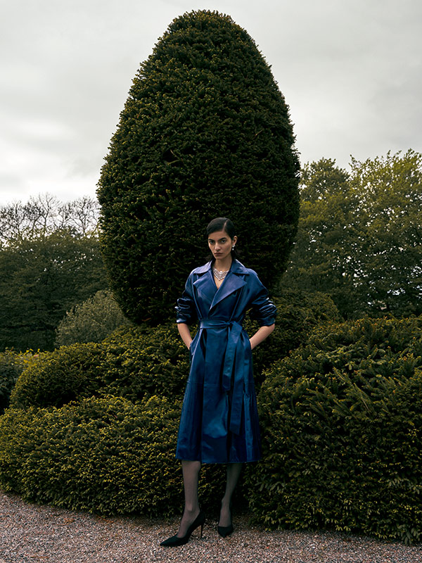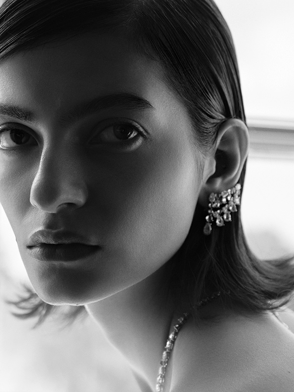 Schmuck von CARTIER HIGH JEWELLERY. („Geopelia“ Collier und Ohrringe aus Platin und Diamanten) Mantel von AKRIS. Strumpfhose von ITEM M6. Schuhe von MICHAEL MICHAEL KORS.