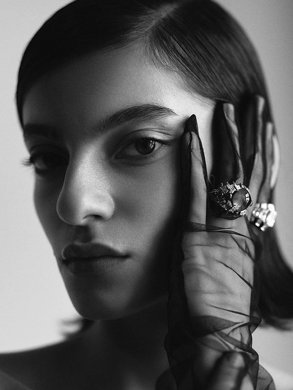 Schmuck von CARTIER HIGH JEWELLERY. („Azulejo“ Ring aus Weißgold, Saphiren und Diamanten. „Skudo“ Ring aus Weißgold, Onyx und Diamanten) Handschuhe von SIMONE ROCHA.