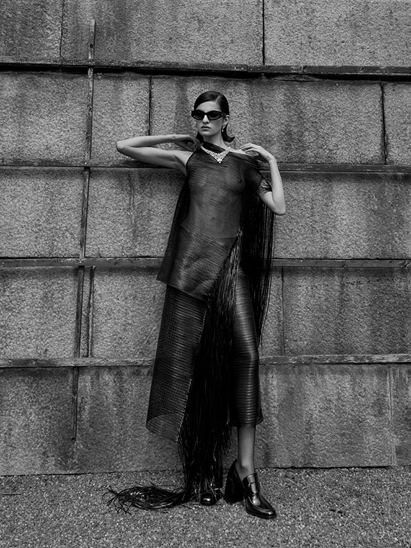 Schmuck von CARTIER HIGH JEWELLERY. („Tsagaan“ Collier und Ohrringe aus Weißgold und Diamanten) Kleid von SPORTMAX. Sonnenbrille von ALAÏA. Schuhe von JIMMY CHOO. Strumpfhose von ITEM M6.