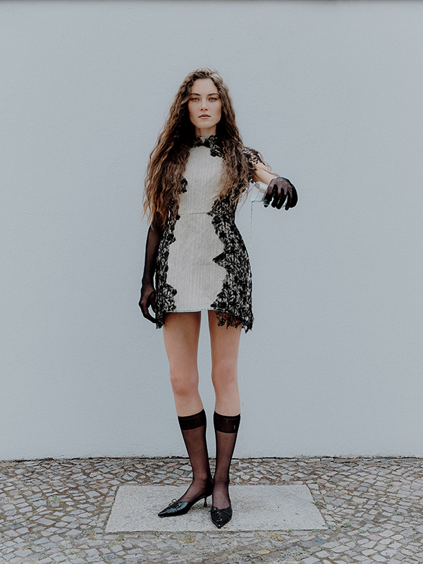 Kleid von DIOR. Strümpfe von FALKE. Schuhe von JIMMY CHOO. Handschuhe von NORMA KAMALI.